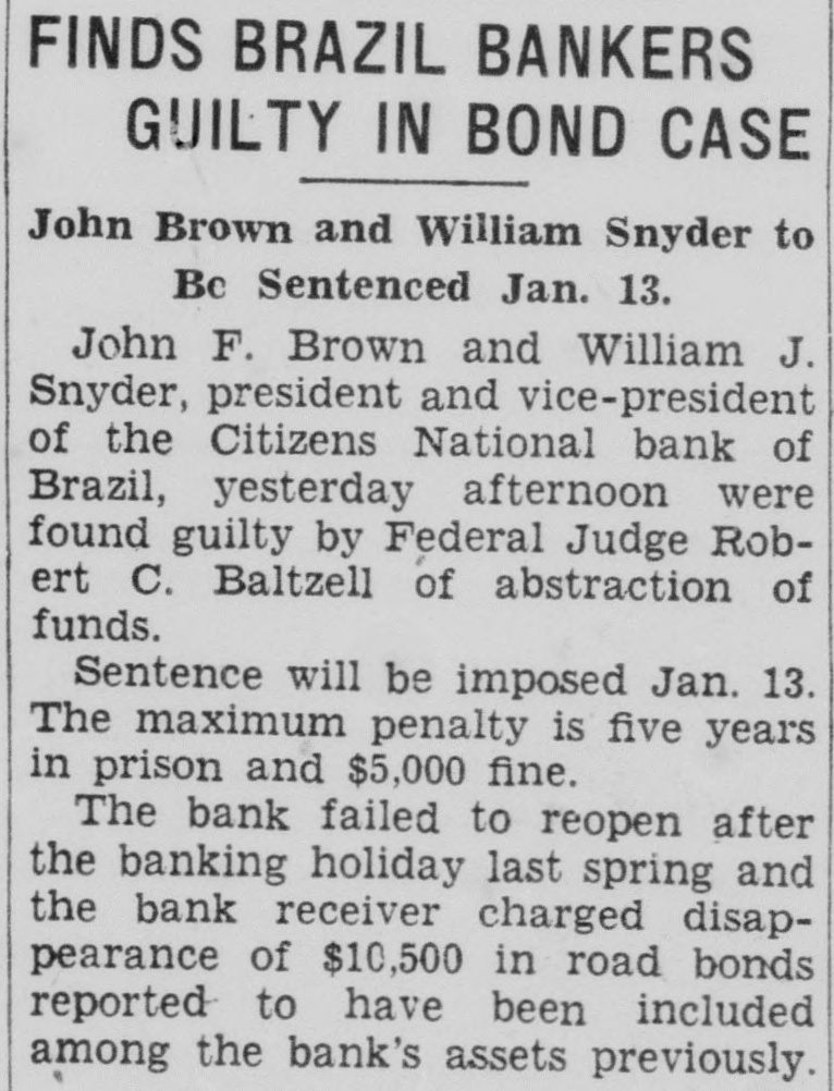 FINDS BRAZIL BANKERS GUILTY IN BOND CASE John Brown and William Snyder to Be Sentenced Jan. 13. John F. Brown and William J. Snyder, president and vice-president of the Citizens National bank of Brazil, yesterday afternoon were found guilty by Federal Judge Robert C. Baltzell of abstraction of funds. Sentence will be imposed Jan. 13. The maximum penalty is five years in prison and $5,000 fine. The bank failed to reopen after the banking holiday last spring and the bank receiver charged disappearance of $10,500 in road bonds reported to have been included among the bank's assets previously.