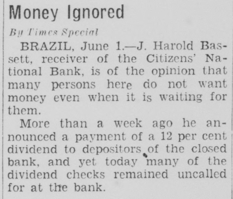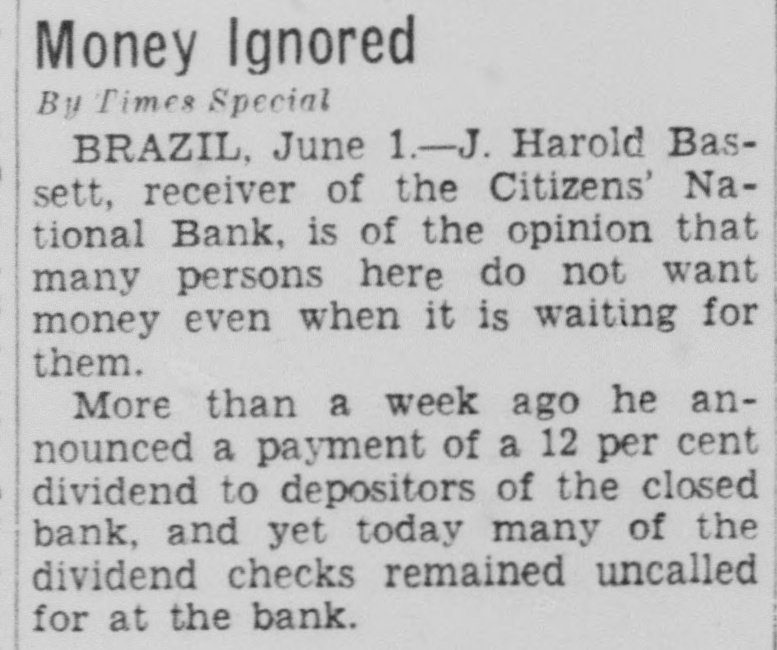 Money Ignored By Times Special BRAZIL, June 1.-J. Harold Bassett, receiver of the Citizens' National Bank, is of the opinion that many persons here do not want money even when it is waiting for them. More than a week ago he announced a payment of a 12 per cent dividend to depositors of the closed bank, and yet today many of the dividend checks remained uncalled for at the bank.