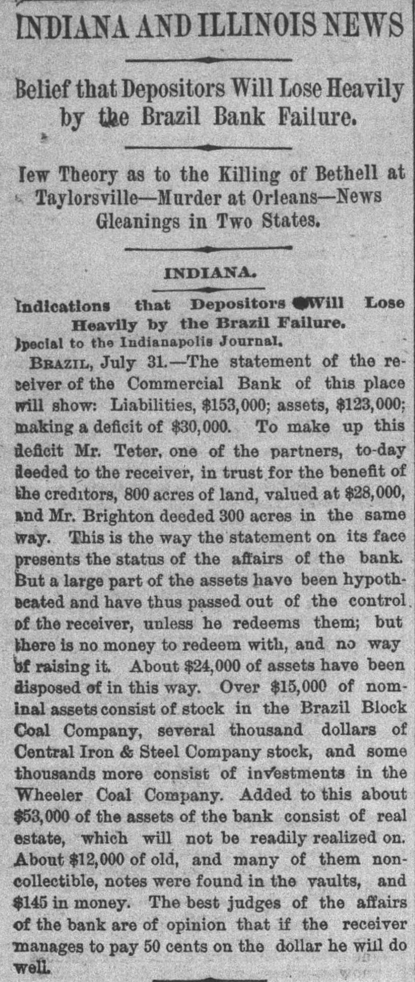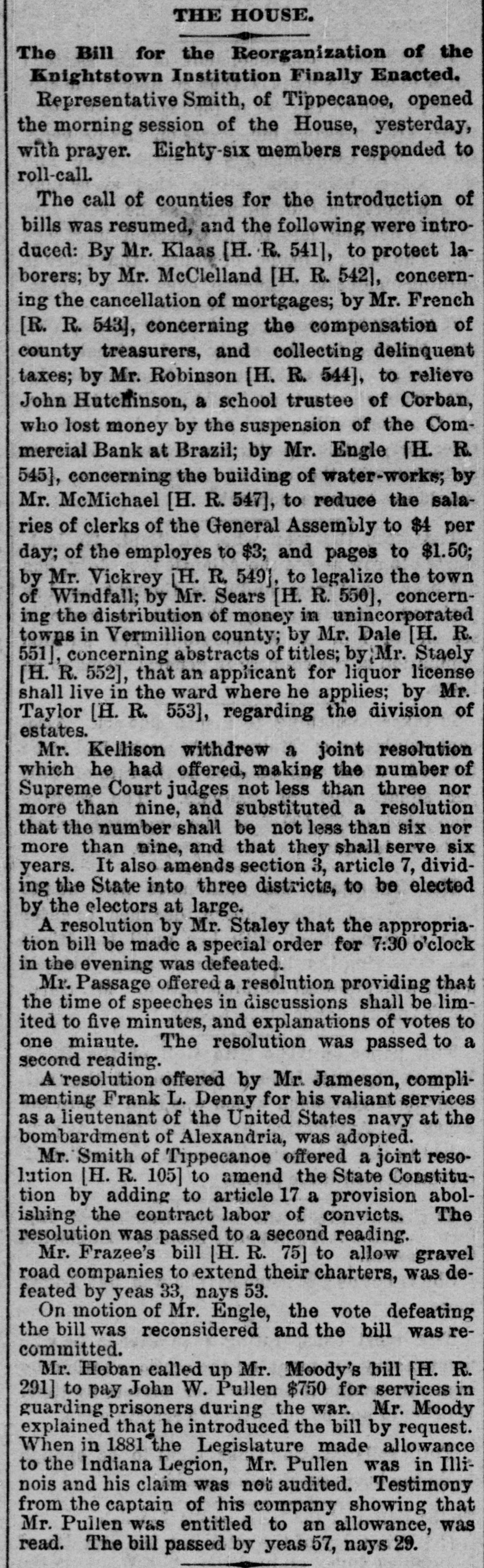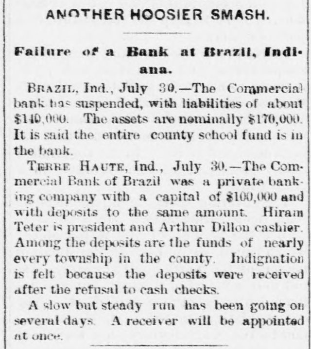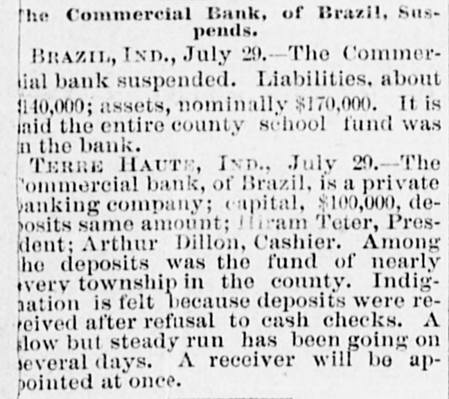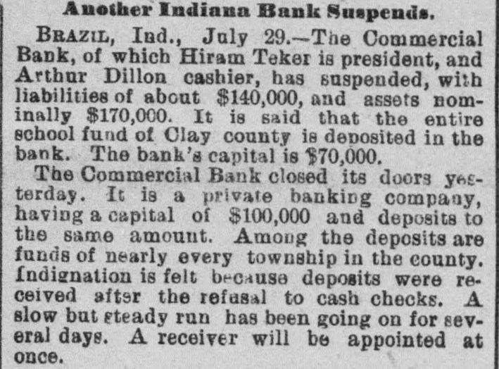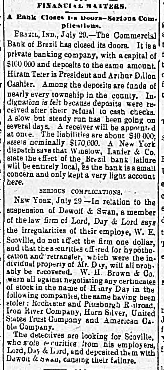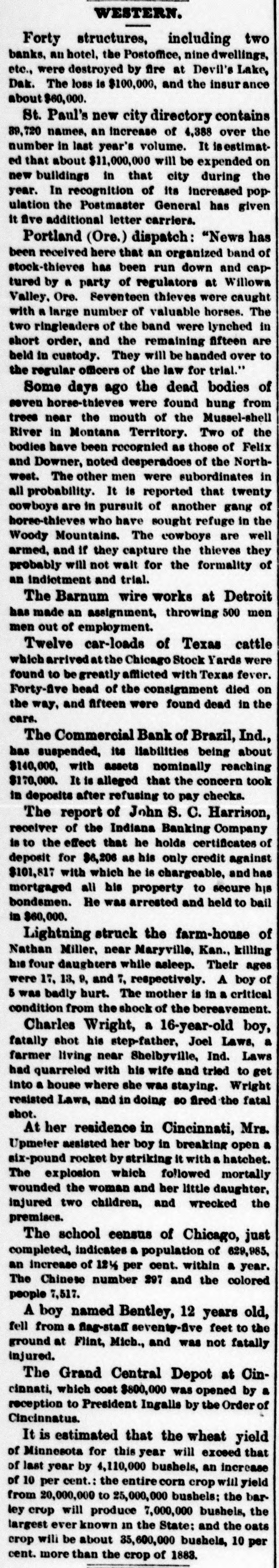 WESTERN. Forty structures, including two banks. an hotel, the Postoffice, nine dwellings, etc., were destroyed by fire at Devil's Lake, Dak. The loss is $100,000, and the insur ance about $60,000. St. Paul's new city directory contains 89,720 names, an increase of 4,388 over the number in last year's volume. It is estimated that about $11,000,000 will be expended on new buildings in that city during the year. In recognition of its increased population the Postmaster General has given it five additional letter carriers. Portland (Ore.) dispatch: "News has been received here that an organized band of stock-thieves has been run down and captured by a party of regulators at Willowa Valley. Ore. Seventeen thieves were caught with a large number of valuable horses. The two ringleaders of the band were lynched in short order, and the remaining fifteen are held in custody. They will be handed over to the regular officers of the law for trial." Some days ago the dead bodies of seven horse-thieves were found hung from trees near the mouth of the Mussel-shell River in Montana Territory. Two of the bodies have been recognied as those of Felix and Downer, noted desperadoes of the Northwest. The other men were subordinates in all probability. It is reported that twenty cowboys are in pursuit of another gang of horse-thieves who have sought refuge in the Woody Mountains. The cowboys are well armed, and if they capture the thieves they probably will not wait for the formality of an indictment and trial. The Barnum wire works at Detroit has made an assignment, throwing 500 men men out of employment. Twelve car-loads of Texas cattle which arrived at the Chicago Stock Yards were found to be greatly afflicted with Texas fever. Forty-five head of the consignment died on the way, and fifteen were found dead in the cars. The Commercial Bank of Brazil, Ind., has suspended, its liabilities being about $140,000, with assets nominally reaching $170,000. It is alleged that the concern took in deposits after refusing to pay checks. The report of John S. C. Harrison, receiver of the Indiana Banking Company is to the effect that he holds certificates of deposit for $6,206 as his only credit against $101,817 with which he is chargeable, and has mortgaged all his property to secure his bondsmen. He was arrested and held to bail in $60,000. Lightning struck the farm-house of Nathan Miller, near Maryville, Kan., killing his four daughters while asleep. Their ages were 17. 13, 9, and 7, respectively. A boy of 5 was badly hurt. The mother is in a critical condition from the shock of the bereavement. Charles Wright, a 16-year-old boy, fatally shot his step-father, Joel Laws, a farmer living near Shelbyville, Ind. Laws had quarreled with his wife and tried to get into a house where she was staying. Wright resisted Laws, and in doing 80 fired the fatal shot. At her residence in Cincinnati, Mrs. Upmeter assisted her boy in breaking open a six-pound rocket by striking it with a hatchet. The explosion which followed mortally wounded the woman and her little daughter, injured two children, and wrecked the premises. The school census of Chicago, just completed, indicates a population of 629,985, an increase of 12% per cent. within a year. The Chinese number 297 and the colored people 7,517. A boy named Bentley, 12 years old, fell from a flag-staff seventy-five feet to the ground at Flint, Mich., and was not fatally injured. The Grand Central Depot at Cincinnati, which cost $800,000 was opened by a reception to President Ingalls by the Order of Cincinnatus. It is estimated that the wheat yield of Minnesota for this year will exceed that of last year by 4,110,000 bushels, an increase of 10 per cent.: the entire corn crop will yield from 20,000,000 to 25,000,000 bushels: the barley crop will produce 7,000,000 bushels, the largest ever known in the State: and the oats crop will be about 35,600,000 bushels, 10 per cent. more than the crop of 1883.