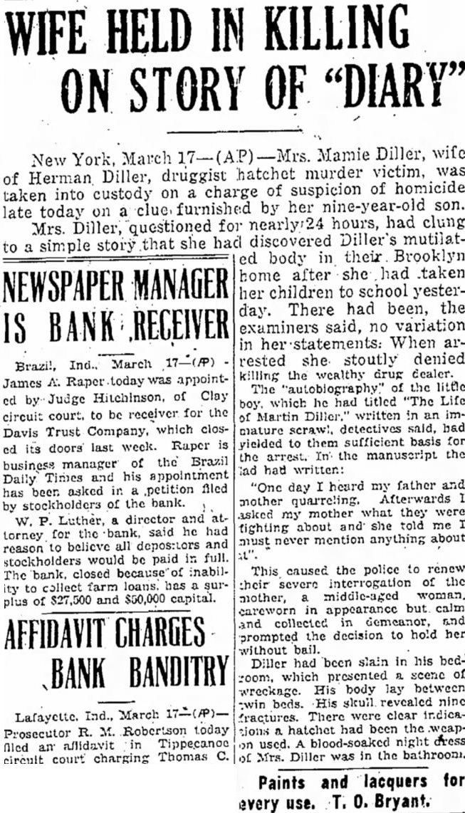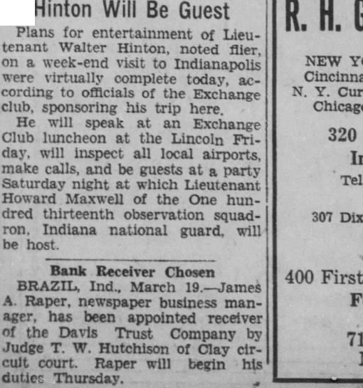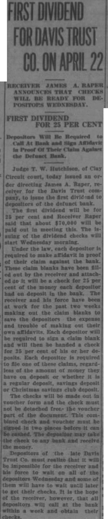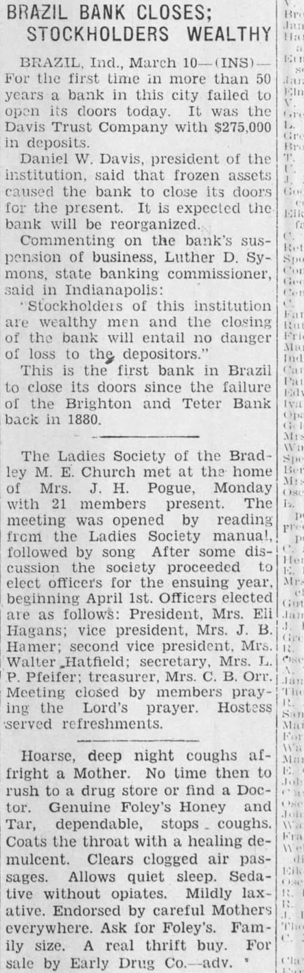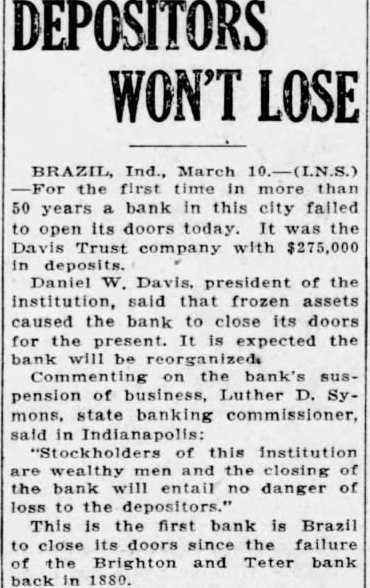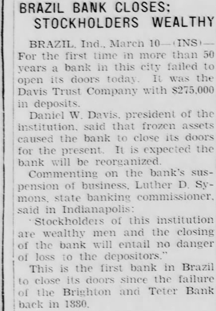 Ind., March the first time in more than years bank in this city failed to open its doors today. It was the Davis Trust Company with $275,000 in deposits. Daniel Davis, president of the said that frozen assets caused bank to close its doors for the present. expected the bank will be reorganized. Commenting on the bank's pension of business, Luther mons, state banking commissioner, said in Indianapolis: Stockholders of this institution wealthy and the closing of the bank will entail no danger of loss to the depositors.' This is the first bank in Brazil to close its doors since the failure of the Brighton and Teter Bank back in