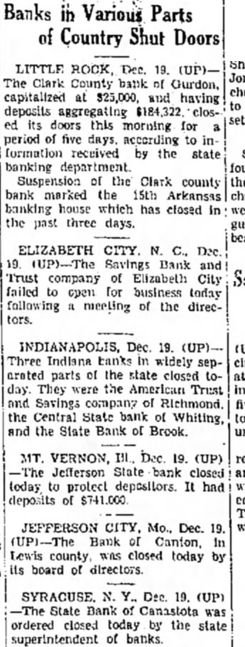 Banks in Various Parts Country Shut Doors ROCK, Dec. 19. The Clark County bank capitalized at $25,000, and having deposits aggregating its doors this morning for period five days, according to formation received by the state banking department. Suspension the Clark county bank marked the 15th Arkansas banking house which has closed the past three days. ELIZABETH CITY. Dec. Savings Bank and Trust company of Elizabeth City failed for business open today following meeting of the directors. INDIANAPOLIS, Dec. 19. Three Indiana banks in widely arated parts of the state closed day. They were the Trust and Savings company of Richmond. the Central State bank of Whiting, and the State Bank of Brook. MT. VERNON, Dec (UP) Jefferson State bank closed today to protect depositors. had deposits of $741.000 JEFFERSON CITY, Mo., Dec. Bank Canton, Lewis county, was closed today by its board of SYRACUSE Dec. 19. (UP) State Bank of Canastota was ordered closed today the state superintendent of