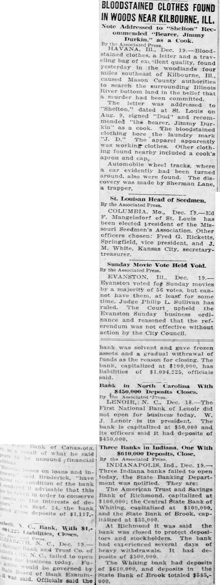 BLOODSTAINED CLOTHES FOUND IN WOODS NEAR KILBOURNE. ILL. Note Addressed to "Shelton" Recommended "Bearer. Jimmy Durkin." as a Cook. the HA VANA, Press. Dec. 19.-Bloodstained clothes. a letter and a traveling bag of exc ellent quality, found yesterday in the woodlands four miles southeast of Kilbourne, III., caused Mason County authorities to search the surrounding Illinois River bottom land in the belief that a murder had been committed. The letter was addressed to "Shelton," dated at St. Louis on Aug. 9, signed "Dud" and recommended "the bearer. Jimmy Durkin as a cook. The bloodstained clothing bore the laundry mark "J. D." The apparel apparently was working clothes. Other clothing found nearby included a cook's apron and cap, Automobile wheel tracks. where a car evidently had been turned around, also were found. The discovery was made by Sherman Lane, a trapper. St. Louisan Head of Seedmen. By the Associated Press. COLUMBIA. Mo., Dec. 19.-Ed F. Mangelsdorf of St. Louis has been elected president of the Missouri Seedmen's Association. Other officers chosen: Fred G. Ricketts, Springfield, vice president, and J. M. White, Kansas City, secretarytreasurer. Sunday Movie Vote Held Void. By the Associated Evanston voted for Sunday movies by a majority of 56 votes, but cannot have them, at least for some time. Judge Philip L. Sullivan has ruled. The Court upheld the Evanston Sunday business ordinance and reasoned that the referendum was not effective without action by the City Council. bank was solvent and gave frozen assets and a gradual withrawal of funds as the reason for closing. The bank, capitalized at $100,000, has liabilities of $1,094,225, officials said. Bank in North Carolina With $450,000 Deposits Closes. By the Associated LENOIR, N. C., Dec. 18.-The First National Bank of Lenoir did not open for business today. W. J. Lenoir is its president. The bank is capitalized at $50,000 and its officers said it had deposits of $450,000. Three Banks in Indiana, One With $610,000 Deposits, Close, By the Press. INDIANAPOLIS. Ind., Dec. 19.Three Indiana banks failed to open today, the State Banking Department was notified. They are: The American Trust and Savings Bank of Richmond. capitalized at 100,000; the Central State Bank of Whiting, capitalized at $100,000, and the State Bank of Brook, capitàlized at $55,000. At Richmond it was said the bank was closed to protect depositors and stockholders. The bank had experienced several days of heavy withdrawals. It had deposits of $500,000. The Whiting bank had deposits of $610,000, and deposits in the State Bank of Brook totaled $585,000.