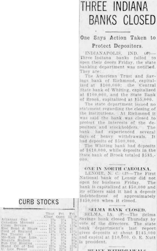 CURB STOCKS THREE INDIANA BANKS CLOSED One Says Action Taken to Protect Depositors INDIANAPOLIS IND. Three Indiana failed to their doors Friday the banking department was notified. Trust and Savings bank of capitalthe Central of Whiting at and the State Bank of Brook capitalized at The department issued the closing of the institutions Richmond it said the bank was closed to protect the interests the depositors and The bank had experienced several of heavy withdrawals. It had deposits of The Whiting bank had deposits of while deposits in the bank of Brook totaled $585.- ONE IN NORTH CAROLINA. National of Lenoir did not open for business Friday The bank capitalized at and its officers said it had a deposit approximately $450,000 when it closed. SELMA BANK CLOSED. Selma bank closed Thursday by vote of the directors. The state bank department's last report deposits at about and capital O. E. Nutt president. HEAVY WITHDRAW ALS.