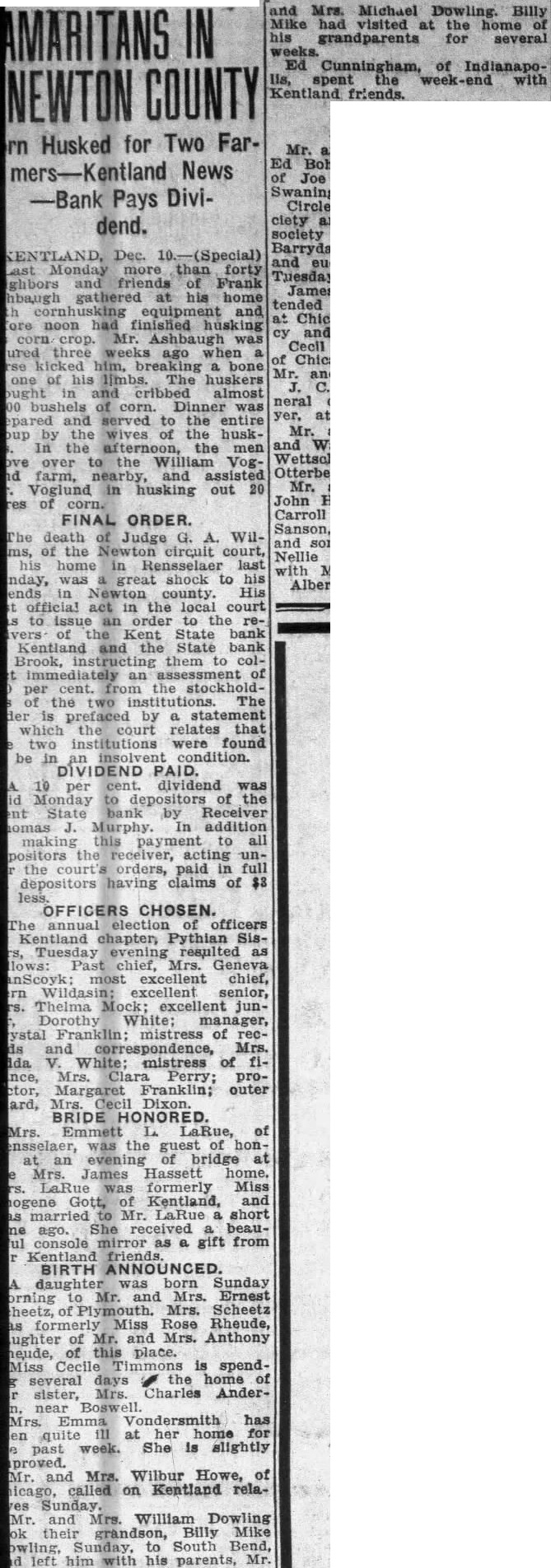 MARITANS IN NEWTON COUNTY rn Husked for Two Farmers-Kentland News -Bank Pays Dividend. Dec. (Special) Last Monday more than forty ghbors friends of Frank hbaugh gathered at his home equipment and noon had finished husking cy and crop. Mr. Ashbaugh was three weeks ago when kicked him, breaking bone one of his The huskers in and cribbed almost bushels of corn. Dinner was pared and served to the entire up the wives of the huskIn the afternoon, the men over to the William VogOtterbein. farm, nearby, and assisted Voglund in husking out 20 of corn. FINAL ORDER. The death Judge G. A. Wilof the Newton circuit court, his home in Rensselaer last with was great shock to his Alberta ends in Newton His official act in the local court to an order to the revers of the Kent State bank Kentland and the State bank Brook, instructing them to colan assessment of per from the stockholdof the two institutions. The is prefaced by statement which court relates that two institutions were found be in an insolvent condition. DIVIDEND PAID. 10 per cent. dividend was Monday depositors of the State bank by Receiver iomas J. Murphy. In addition making this payment to all positors the receiver, acting unthe court' orders, paid in full depositors having claims of $3 OFFICERS CHOSEN. The annual election officers Kentland chapter, Pythian SisTuesday evening resulted as lows: Past chief, Mrs. Geneva most excellent chief, excellent senior, Thelma Mock; excellent junDorothy manager, ystal Franklin; mistress of recand correspondence, Mrs. V. White: mistress of fiMrs. Clara Perry; proMargaret Franklin; outer ard, Mrs. Dixon. BRIDE HONORED. Mrs. Emmett LaRue, of ensselaer, was the guest of honat an evening of bridge at Mrs. James Hassett home. LaRue was formerly Miss Gott, Kentland, and married to Mr. LaRue short She received beauconsole mirror as a gift from Kentland friends. BIRTH ANNOUNCED. daughter was born Sunday brning to Mr. and Mrs. Ernest heetz, of Plymouth. Mrs. Scheetz formerly Miss Rose Rheude, ughter of Mr. and Mrs. Anthony of this place. Miss Cecile Timmons is spendseveral days the home of sister, Mrs. Charles Andernear Mrs. Emma Vondersmith has quite at her home for past week. She is alightly proved. Mr. and Mrs. Wilbur Howe, of icago, called on Kentland relaMr. and Mrs. William Dowling their grandson, Billy Mike owling, Sunday, to South Bend, left him with his parents, Mr and Mrs. Michael Dowling. Billy Mike had visited at the home his grandparents for several weeks. Ed Cunningham, of Indianapospent the week with Kentland friends.