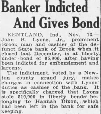 Banker Indicted And Gives Bond Ind. Nov. John Lyons, prominent Brook man and cashier of the defunct State bank Brook when closed last liberty bond of after been indicted for and The indictment, voted by Newgrand makes charges connection with Lyons' duties as of the bank. stole liberty bonds longing Dixon, which had left in the bank for safe keeping