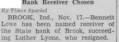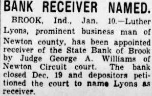 BANK RECEIVER NAMED. BROOK, Ind., Jan. 10.-Luther Lyons, prominent business man of Newton has been appointed receiver the State Bank of Brook by Judge George Williams of Newton Circuit court The bank closed Dec. 19 and petitioned the court to name Lyons as receiver.