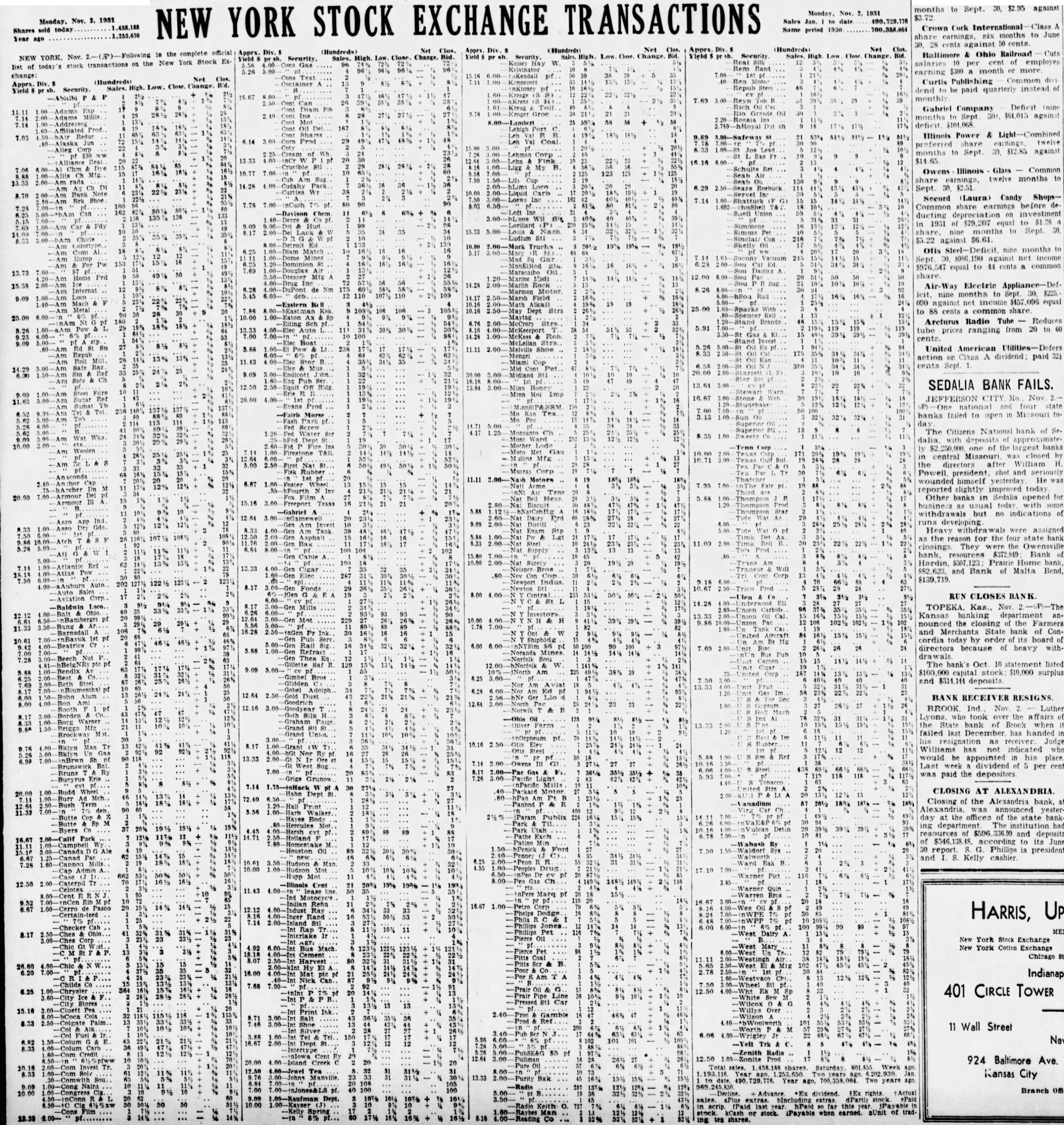 YORK STOCK EXCHANGE TRANSACTIONS NEW Nov. Shares sold today Year ago Sales Jan. date Same period Net Clos. Apprx. Div. (Hundreds) Net Apprx. (Hundreds) Net complete Apprx. (Hundreds) Following is Security High NEW Security High Low New York W transactions on list stock change: Net (Hundreds) Apprx. Security 13.73 nine months to Sept. Field 000 against net income $457 096 equal Dept Sparks to 88 cents common share. Arcturus Radio Tube Reduces tube prices ranging from 20 to 60 United American Utilities-Defers 11.11 action on Class A dividend: paid 321 cents Sept. SEDALIA BANK FAILS. JEFFERSON CITY Mo. Nov and four banks failed to open in Missouri toThe Citizens National bank of dalia with deposits approximately one of the largest banks in central Missouri was closed by the directors after William H. Powell president shot and seriously 11.11 Motors wounded himself yesterday He 6.67 reported slightly improved today Other banks in Sedalia opened for business usual today with withdrawals but no indications of runs developing Heavy withdra assigned as the reason for the four state bank closings They the Owensville bank. resources $372,849 Bank of and Bank of Malta Bend, RUN CLOSES BANK. TOPEKA. Kas., Nov Kansas banking department nounced the closing of the and Merchants State bank of Concordia today by order its board of 6.00 directors because of heavy with5.88 The bank's Oct 10 statement listed $100,000 capital stock $10,000 surplus and $314.144 deposits. BANK RECEIVER RESIGNS 12.64 BROOK Ind. Nov Luther Lyons. who took over the affairs the State bank of Brook when failed last December has handed in his resignation as receiver Judge Williams has not indicated who would be appointed in his place. Last week dividend of 5 per cent was paid the depositors. 7.14 CLOSING AT ALEXANDRIA. Closing of the Alexandria bank, at Alexandria, was announced yesterPublix day the offices of the state bankdepartment The institution had resources of $596 and deposits $546,138.48 according to its June 30 report. S. Phillips is president and Kelly cashier Rap Pet 8.17 Oil New York Stock Exchange Mach New York Cotton Exchange Cement 7.68 6.25 401 CIRCLE TOWER 8.33 11 Wall Street 924 Baltimore Ave. Tea Kansas City Two years Film when earned. aUnit stock. shares.