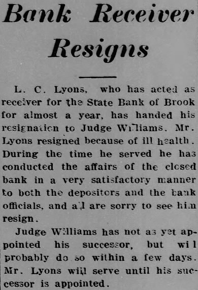 Bank Receiver Resigns L. C. Lyons, who has acted as receiver for the State Bank of Brook for almost a year, has handed his resignation to Judge Wiliams. Mr. Lyons resigned because of ill health During the time he served he has conducted the affairs of the closed bank in a very satisfactory manner to both the depositors and the bank officials, and al are sorry to see him resign. Judge Williams has not a3 yet appointed his successor, but will probably do 50 within a few days. Mr. Lyons will serve until his successor is appointed.