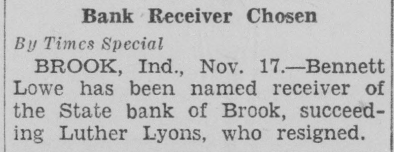 Bank Receiver Chosen By Times Special BROOK, Ind., Nov. 17.-Bennett Lowe has been named receiver of the State bank of Brook, succeeding Luther Lyons, who resigned.