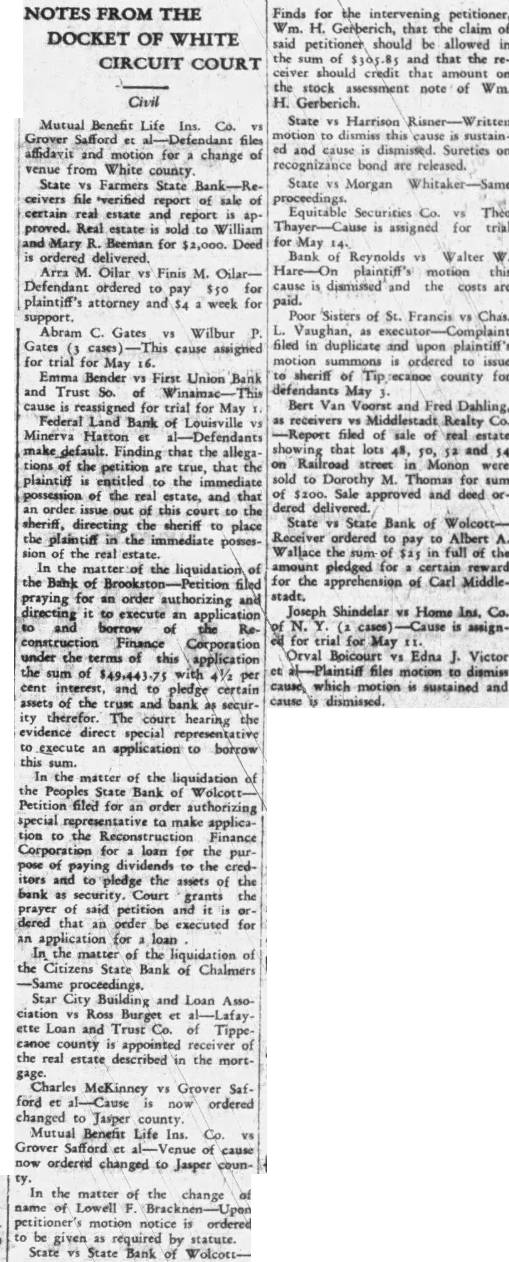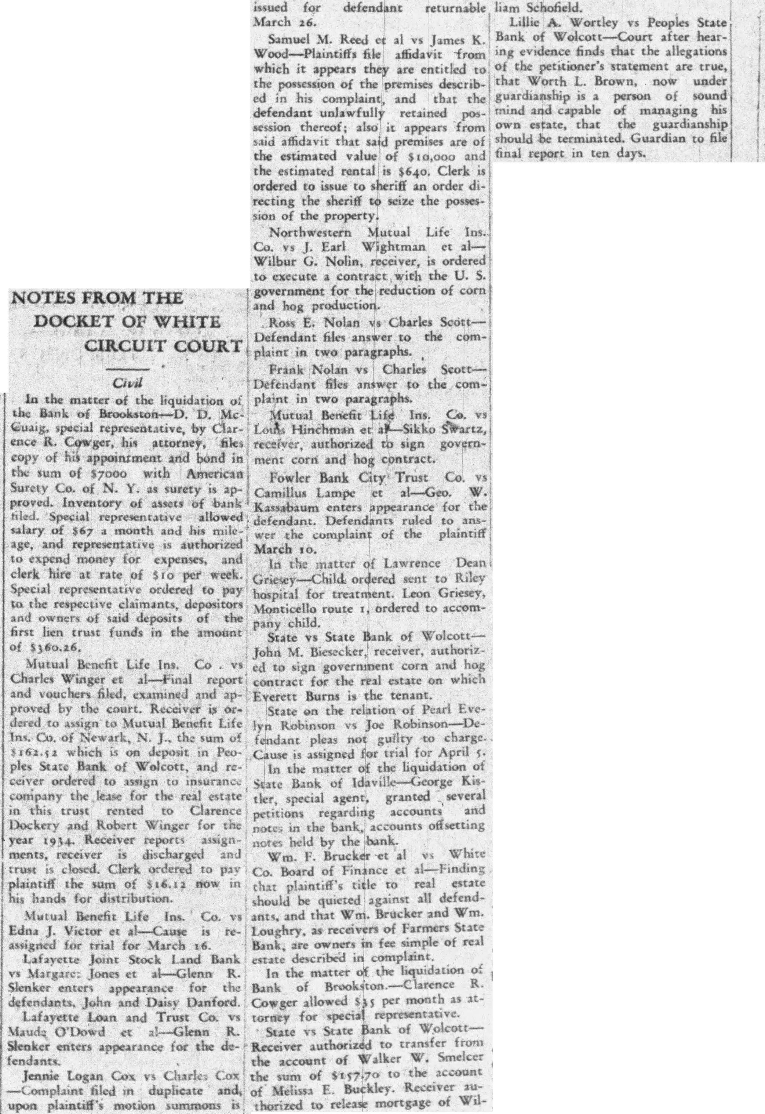 NOTES FROM THE DOCKET OF WHITE CIRCUIT COURT Civil In the matter of the liquidation of the Bank of Brookston-D D. McGuaig, special representative, by Clarence R. Cowger, his attorney, files copy of his appointment and bond in the sum of $7000 with American Surety Co. of N. Y. as surety is approved. Inventory of assets of bank tiled. Special representative allowed salary of $67 month and his mileage, and representative IS authorized to expend money for expenses, and clerk hire at rate of per week. Special representative ordered to pay to the respective claimants, depositors and owners of said deposits of the first lien trust funds in the amount of Mutual Benefit Life Ins. Co Charles Winger et al-Final report and vouchers filed, examined and approved by the court. Receiver is ordered to assign to Mutual Benefit Life Ins. Co. of Newark, the sum of which is on deposit in Peoples State Bank of Wolcott, and ceiver ordered to assign to insurance company the lease for the real estate in this trust rented to Clarence Dockery and Robert Winger for the year 1934. Receiver reports assignments, receiver is discharged and trust is closed. Clerk ordered to pay plaintiff the sum of now in his hands for distribution. Mutual Benefit Life Ins. Co. Edna J. Victor et al-Cause is reassigned for trial for March 16. Lafayette Joint Stock Land Bank Margare: Jones et R. Slenker enters appearance for the defendants, John and Daisy Danford. Lafayette Loan and Trust Co. vs Maude O'Dowd et al-Glenn R. Slenker enters appearance for the defendants. Jennie Logan Cox vs Charles Cox Complaint filed in duplicate and, upon plaintiff's motion summons is issued for defendant returnable March 26. Samuel M. Reed et al vs James K. Wood-Plaintiffs file affidavit from which it appears they are entitled to the possession of the premises described in his complaint, and that the defendant unlawfully retained possession thereof; also it appears from said affidavit that said premises are of the estimated value of $10,000 and the estimated rental is $640. Clerk is ordered to issue to sheriff an order directing the sheriff to seize the possession of the property. Northwestern Mutual Life Ins. Co. J. Earl Wightman et alWilbur G. Nolin, receiver, is ordered to execute contract with the government for the reduction of corn and hog production. Ross E. Nolan vs Charles ScottDefendant files answer to the complaint in two paragraphs. Frank Nolan Charles ScottDefendant files answer to the complaint in two paragraphs. Mutual Benefit Life Ins. Co. Louis Hinchman et Swartz, receiver, authorized to sign government corn and hog contract. Fowler Bank City Trust Co. vs Camillus Lampe et al-Geo. W. Kassabaum enters appearance for the defendant. Defendants ruled to answer the complaint of the plaintiff March 10. In the matter of Lawrence Dean ordered sent to Riley hospital for treatment. Leon Griesey, Monticello route ordered to accomchild. pany State vs State Bank of WolcottJohn M. Biesecker, receiver, authorized to sign government corn and hog contract for the real estate on which Everett Burns is the tenant. the relation of Pearl EveState on lyn Robinson vs Joe fendant pleas not guilty to charge. Cause assigned for trial for April the of the liquidation of In matter State Bank of Kistler, special agent, granted several petitions regarding accounts and notes the bank, accounts offsetting notes held by the bank. White Wm. F. Brucker et al Co. Board of Finance et al-Finding title to real estate that plaintiff's should be quieted against all defendants, and that Wm. Brucker and Wm. Loughry, as receivers of Farmers State Bank, owners in fee simple of real estate described in complaint. liquidation of In the matter of the Bank of R. Cowger allowed $35 per month as attorney for special representative. State vs State Bank of WolcottReceiver authorized to transfer from Walker W. Smelcer the account of to the account the sum of $157.70 Buckley. Receiver auof Melissa E. thorized to release mortgage of Wil- liam Schofield. Lillie A. Wortley vs Peoples State Bank of after hearing evidence finds that the allegations of the petitioner's statement are true, that Worth L. Brown, now under guardianship is person of sound mind and capable of managing his own estate, that the guardianship should be terminated. Guardian to file final report in ten days.