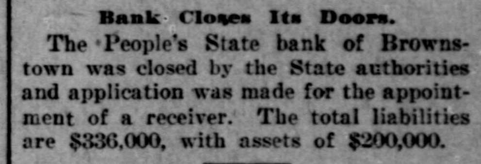 Bank Closes Its Doors. The People's State bank of Brownstown was closed by the State authorities and application was made for the appointment of a receiver. The total liabilities are $336,000, with assets of $200,000.