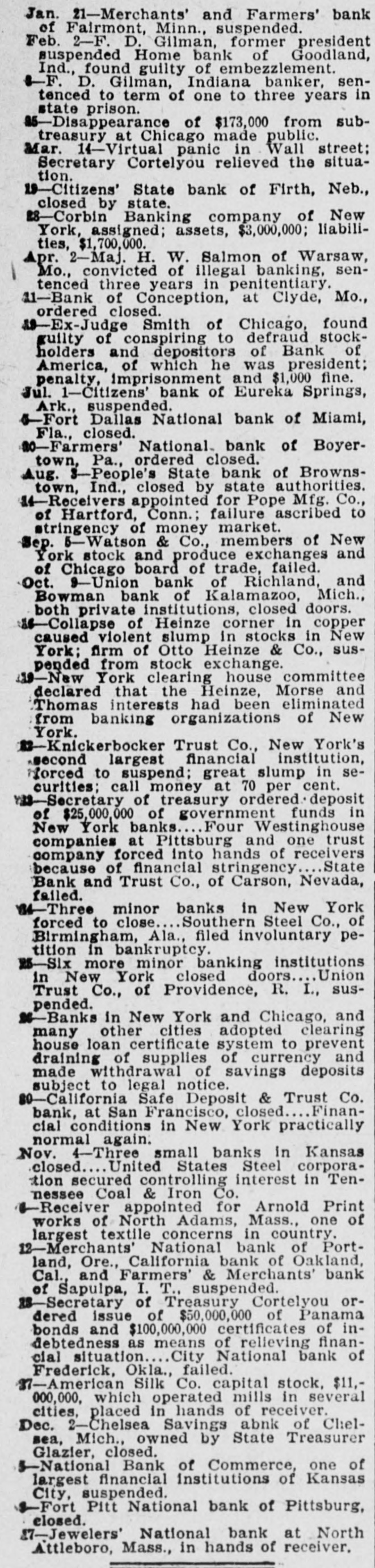 Jan. 21-Merchants' and Farmers' bank of Fairmont, Minn., suspended. Feb. 2-F. D. Gilman, former president suspended Home bank of Goodland, Ind., found guilty of embezzlement. F. D. Gilman, Indiana banker, sentenced to term of one to three years in state prison. 5-Disappearance of $173,000 from subtreasury at Chicago made public. Mar. 14-Virtual panic in Wall street; Secretary Cortelyou relieved the situation. "Citizens' State bank of Firth, Neb., closed by state. 18-Corbin Banking company of New York, assigned; assets, $3,000,000; liabilities, $1,700,000. Apr. 2-Maj. H. W. Salmon of Warsaw, Mo., convicted of illegal banking, sentenced three years in penitentiary. 11-Bank of Conception, at Clyde, Mo., ordered closed. -Ex-Judge Smith of Chicago, found guilty of conspiring to defraud stockholders and depositors of Bank of America, of which he was president; penalty, imprisonment and $1,000 fine. Jul. 1-Citizens' bank of Eureka Springs, Ark., suspended. 5-Fort Dallas National bank of Miami, Fla., closed. #0-Farmers' National. bank of Boyertown, Pa., ordered closed. Aug. 3-People's State bank of Brownstown, Ind., closed by state authorities. 14-Receivers appointed for Pope Mfg. Co., of Hartford, Conn.; failure ascribed to stringency of money market. Sep. 5-Watson & Co., members of New York stock and produce exchanges and of Chicago board of trade, failed. Oct. 9-Union bank of Richland, and Bowman bank of Kalamazoo, Mich., both private institutions, closed doors. -Collapse of Heinze corner in copper caused violent slump in stocks in New York; firm of Otto Heinze & Co., suspended from stock exchange. 19-New York clearing house committee declared that the Heinze, Morse and Thomas interests had been eliminated from banking organizations of New York. -Knickerbocker Trust Co., New York's second largest financial institution, Horced to suspend; great slump in securities; call money at 70 per cent. Secretary of treasury ordered deposit of $25,000,000 of government funds in New York banks. Four Westinghouse companies at Pittsburg and one trust company forced into hands of receivers because of financial stringency State Bank and Trust Co., of Carson, Nevada, failed. M-Three minor banks in New York forced to close Southern Steel Co., of Birmingham, Ala., filed involuntary petition in bankruptcy. MSix more minor banking institutions in New York closed doors Union Trust Co., of Providence, R. I., suspended. #-Banks in New York and Chicago, and many other cities adopted clearing house loan certificate system to prevent draining of supplies of currency and made withdrawal of savings deposits subject to legal notice. 0-California Safe Deposit & Trust Co. bank, at San Francisco, closed Financial conditions in New York practically normal again. Nov. 4-Three small banks in Kansas closed United States Steel corporation secured controlling interest in Tennessee Coal & Iron Co. -Receiver appointed for Arnold Print works of North Adams, Mass., one of largest textile concerns in country. 12-Merchants' National bank of Portland, Ore., California bank of Oakland, Cal., and Farmers' & Merchants' bank of Sapulpa, I. T., suspended. B-Secretary of Treasury Cortelyou ordered issue of $50,000,000 of Panama bonds and $100,000,000 certificates of indebtedness as means of relieving financial situation City National bank of Frederick, Okla., failed. 17-American Silk Co. capital stock, $11,000,000, which operated mills in several cities, placed in hands of receiver. Dec. 2-Chelsea Savings abnk of Chelsea, Mich., owned by State Treasurer Glazier, closed. I-National Bank of Commerce, one of largest financial Institutions of Kansas City, suspended. Fort Pitt National bank of Pittsburg, closed. 47-Jewelers' National bank at North Attleboro, Mass., in hands of receiver.