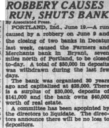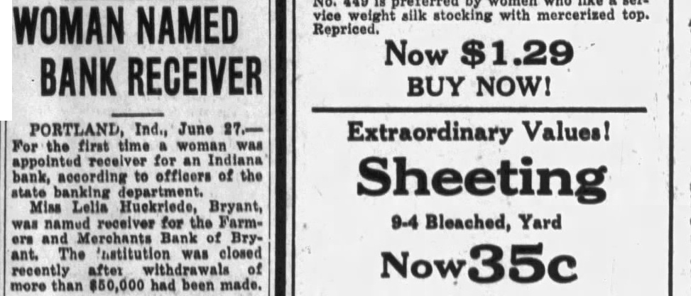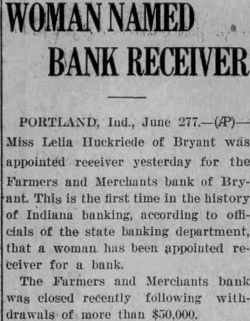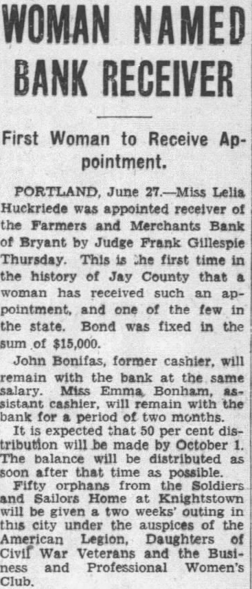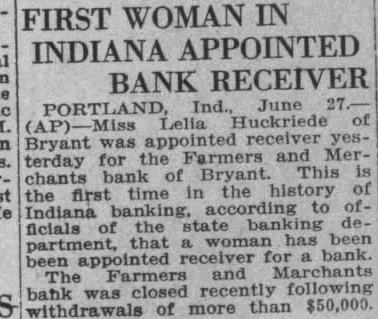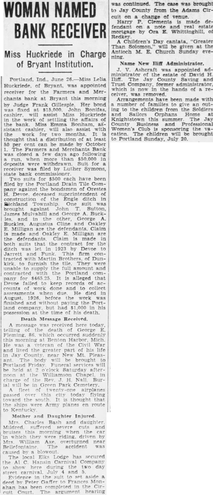 Portland. Ind., June 26.-Miss Lelia Huckriede. of Bryant. was appointed receiver for the Farmers and Merchants bank at Bryant this morning by Judge Frank Gillespie Her bond was fixed at $15,000 John Bonifas, cashier will assist Miss Huckriede in the work of settling the affairs of the bank Miss Emma Bonham, assistant cashier, will also assist with the work for two months It is thought that a distribution of at least 50 per cent can be made by October The Farmers and Merchants Bank was closed a few days ago following a run. when more than $50,000 in deposits were withdrawn. Suit for a receiver was filed by Luther Symons, state bank commissioner Two suits for $500 each have been filed by the Portland Drain Tile Company against the bondsmen of Orestes H. Devoe superintendent of construction of the Engle ditch in Bichland One suit was brought against John T Sutton, James Mulvahill and George A. Buckles. and the other, George A. Buckles, Augustus Cline and Oakley E. Milligan the defendants. Claim is made and Oakley E. Milligan are the defendants Claim is made in both suits that the contract for the ditch was let 1923 by Devoe to Jarrett and Funk This firm contracted with Martin Brothers of Dunkirk. to furnish the tile They were unable supply the amount and contracted with the Portland company for $465 It is alleged that Devoe failed to keep records of counts of done and to collect assessments when due He died in August. 1926 before the work was finished and without paying the Port land company but had $1,000 in his possession at the time of his death. Death Message Received A message was here today telling of the death of George E. Fleming 86. which suddenly this morning at Benton Harbor, Mich He was veteran of the Civil War and lived the greater part of his life in Jay County near New Mt. Pleasant. body be brought Friday will be held at o'clock Saturday after noon at the Williamson Chapel in charge of the Rev H. Nall Bur ial will be in Park Cemetery A fleet of twenty airplanes passed this city today flying toward the south It is thought that the ships were Army planes en route to Kentucky