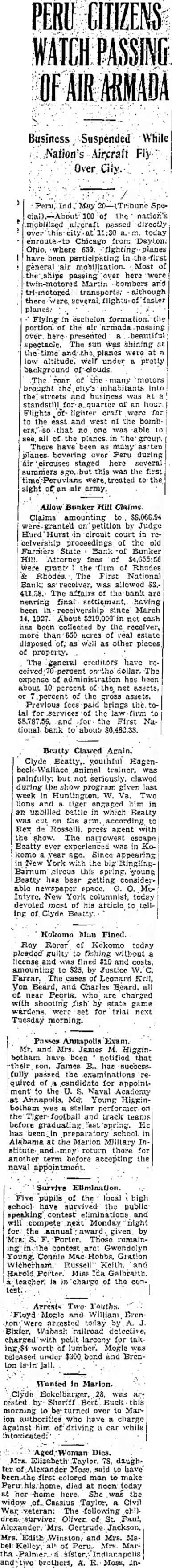Aged Woman Dics. Mrs. Elizabeth Taylor. 78, daughter of Alexander Moss. said to have first colored man to make Peru his home, died noon today at ner home here. She was the War veteran: The following chi). dren survive: Oliver of St. Paul, Mrs. Edith Winston, and Mrs. Ms. bel Kelley, all of Peru. Mrs. Martha Palmer sister, Indianapells and brothers, A. R. Moss, In-
