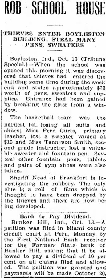 HOUSE THIEVES ENTER BUILDING; STEAL MANY PENS, SWEATERS Boyleston, Ind., Oct. 13 (Tribune the school WHS opened this morning was discovcred that thieves had the building time during end and stolen worth of pens, and supplies. had been gained by breaking the glass from window. The basketball team was the hardest hit, losing all suits and shoes; Miss Fern Curts, primary Leacher, lost sweater valued at $10 and Miss Tennyson Smith, second grade instructor, valuable and pen. Several other pens, tablets and pairs of gym shoes were also taken. Sheriff Nead of Frankfort is investigating the robbery. The clue roll films which thought have been dropped by the thieves and these are now bcIng developed. Bank to Pay Dividend. Bunker Hill, Ind., Oct. petition was filed In Miami county circuit court at Peru, Monday by the First National Bank, receiver the Formers State bank of Bunker Hill, asking that It be lowed to pay dividend of per cent all claims filed and allowThe petition was granted and payments will be made October