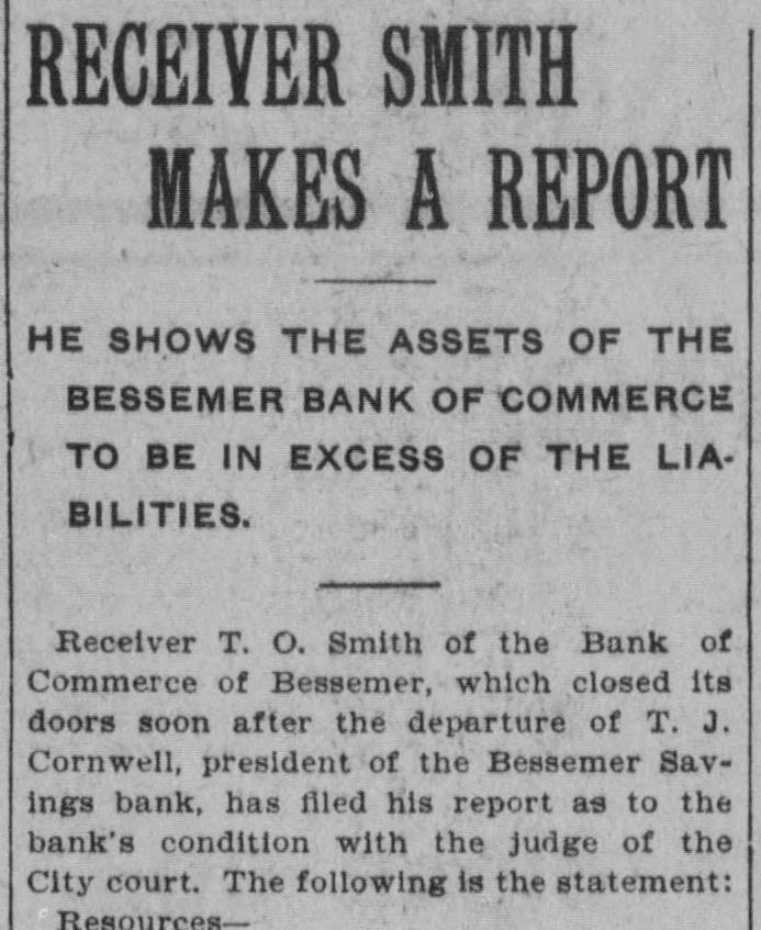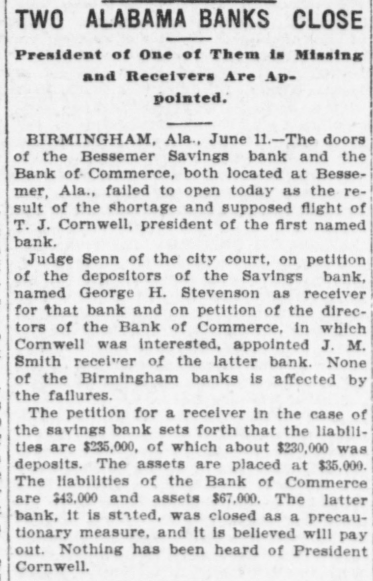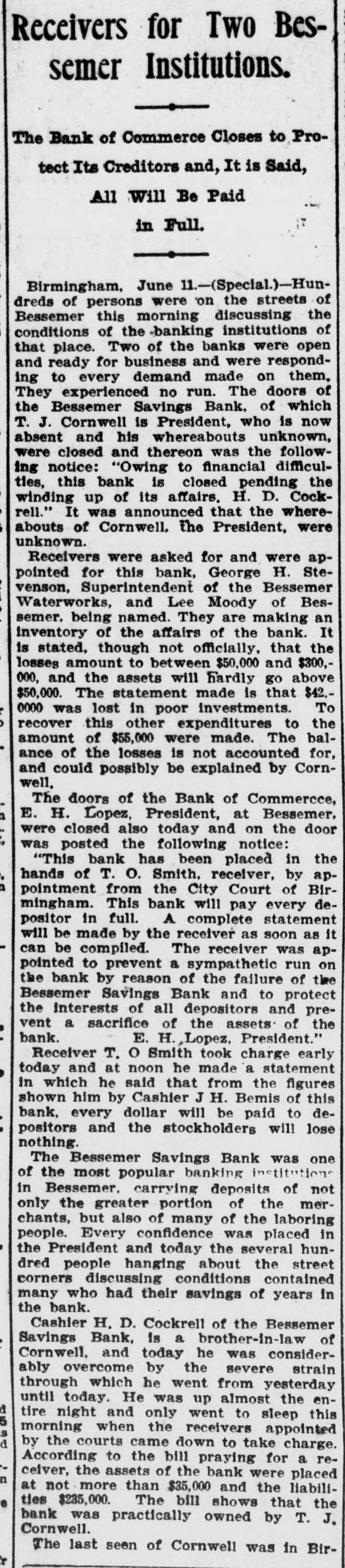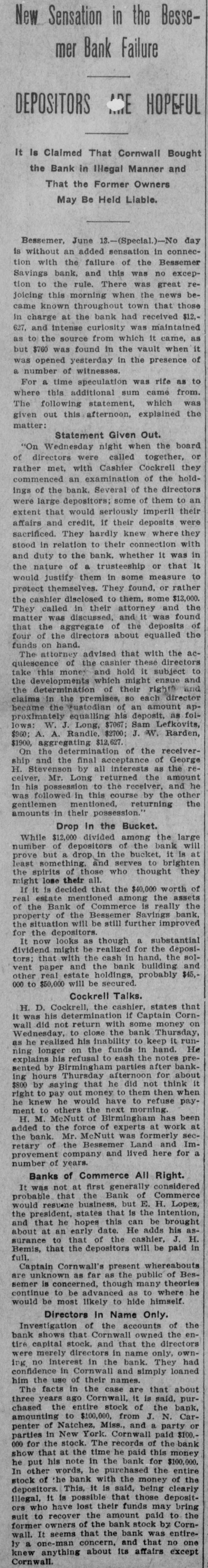 New Sensation in the Bessemer Bank Failure the HOPEFUL DEPOSITORS It Is Claimed That Cornwall Bought the Bank in Illegal Manner and That the Former Owners May Be Held Liable. Bessemer, June 13.-(Special.)-No day is without an added sensation in connection with the failure of the Bessemer Savings bank, and this was no exception to the rule. There was great rejoicing this morning when the news became known throughout town that those in charge at the bank had received $12.627, and intense curiosity was maintained as to the source from which it came, as but $760 was found in the vault when it was opened yesterday in the presence of a number of witnesses. For a time speculation was rife as to where this additional sum came from. The following statement, which was given out this afternoon, explained the matter: Statement Given Out. "On Wednesday night when the board of directors were called together, or rather met, with Cashier Cockrell they commenced an examination of the holdings of the bank. Several of the directors were large depositors; some of them to an extent that would seriously imperil their affairs and credit, if their deposits were sacrificed. They hardly knew where they stood in relation to their connection with and duty to the bank. whether it was in the nature of a trusteeship or that it would justify them in some measure to protect themselves. They found, or rather the cashier disclosed to them, some $13,000. They called in their attorney and the matter was discussed, and it was found that the aggregate of the deposits of four of the directors about equalled the funds on hand. The attorney advised that with the acquiescence of the cashier these directors take this money and hold it subject to the developments which might ensue and the determination of their rights and claims in the premises, so each director apbecame the custodian of an amount proximately equalling his deposit, as follows: W. J. Long, $7067; Sam Lefkovits, $960; A. A. Randle, $2700; J. W. Rarden, $1900, aggregating $12,627 On the determination of the receivership and the final acceptance of George H. Stevenson by all interests as the recelver, Mr. Long returned the amount in his possession to the receiver, and he was followed in this course by the other the gentlemen mentioned, returning amounts in their possession. Drop In the Bucket. While $12,000 divided among the large number of depositors of the bank will prove but a drop in the bucket, it is at least something, and serves to brighten the spirits of those who thought they might lose their all. If it is decided that the $40,000 worth of real estate mentioned among the assets of the Bank of Commerce is really the property of the Bessemer Savings bank, the situation will be still further improved for the depositors. It now looks as though a substantial dividend might be realized for the deposi- soltors; that with the cash in hand, the vent paper and the bank building and other real estate holdings, probably $45,000 to $50,000 will be secured Cockrell Talks. H. D. Cockrell, the cashier, states that it was his determination if Captain Cornwall did not return with some money on Wednesday, to close the bank Thursday, as he realized his inability to keep it runHe ning longer on the funds in hand. explains his refusal to eash the notes presented by Birmingham parties after banking hours Thursday afternoon for about it $800 by saying that he did not think right to pay out money to them then when he knew he would have to refuse payment to others the next morning. H. M. McNutt of Birmingham has been added to the force of experts at work at the bank. Mr. McNutt was formerly secretary of the Bessemer Land and Improvement company and lived here for a number of years. Banks of Commerce All Right. It was not at first generally considered probable that the Bank of Commerce would resuone business, but E. H. Lopez, the president, states that is the intention, and that he hopes this can be brought about at an early date. He adds his assurance to that of the cashier, J. H. Bemis, that the depositors will be paid in full. Captain Cornwall's present whereabouts are unknown as far as the public of Bessemer is concerned, though many theories continue to be advanced as to where he would be most likely to hide himself. Directors In Name Only. Investigation of the accounts of the bank shows that Cornwall owned the entire capital stock, and that the directors were merely directors in name only, owning no interest in the bank. They had confidence in Cornwall and simply loaned him the use of their names. The facts in the case are that about three years ago Cornwall, it is said, purchased the entire stock of the bank, amounting to $100,000. from J. N. Carpenter of Natchez, Miss., and a party or parties in New York. Cornwall paid $100.000 for the stock. The records of the bank show that at the time he paid this money he put his note in the bank for $100,000. In other words, he purchased the entire stock of the bank with the money of the depositors. This, it is said, being clearly illegal, it is possible that those depositors who have lost their funds may bring suit to recover the amount paid to the former owners of the bank stock by Cornwall. It seems that the bank was entirely a one-man concern, and that no one knew anything about its affairs except Cornwall.