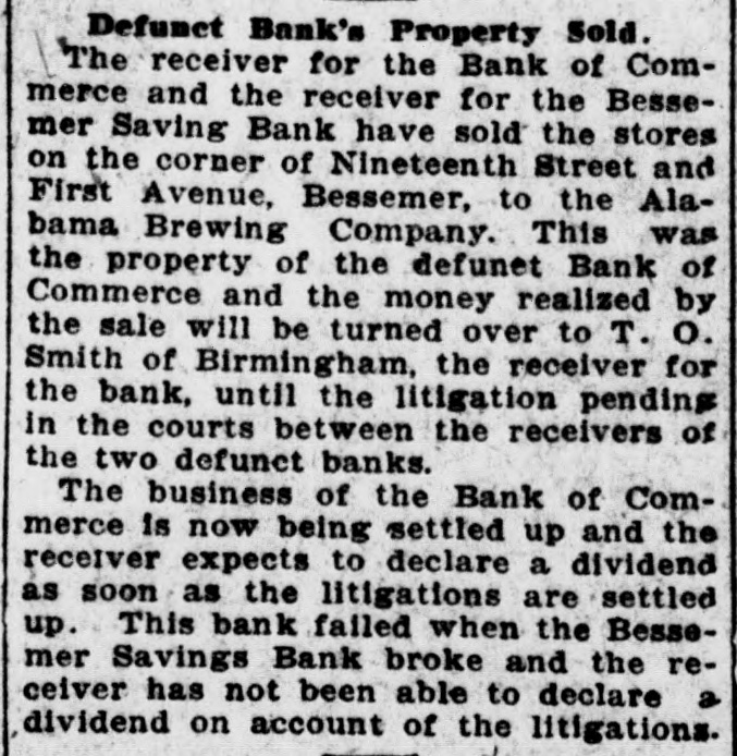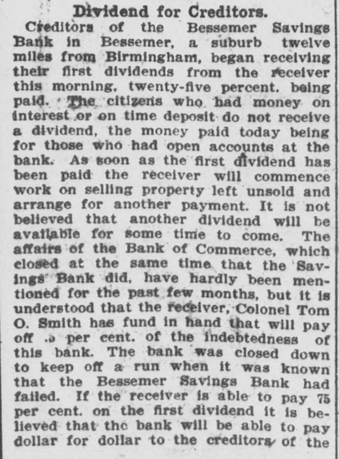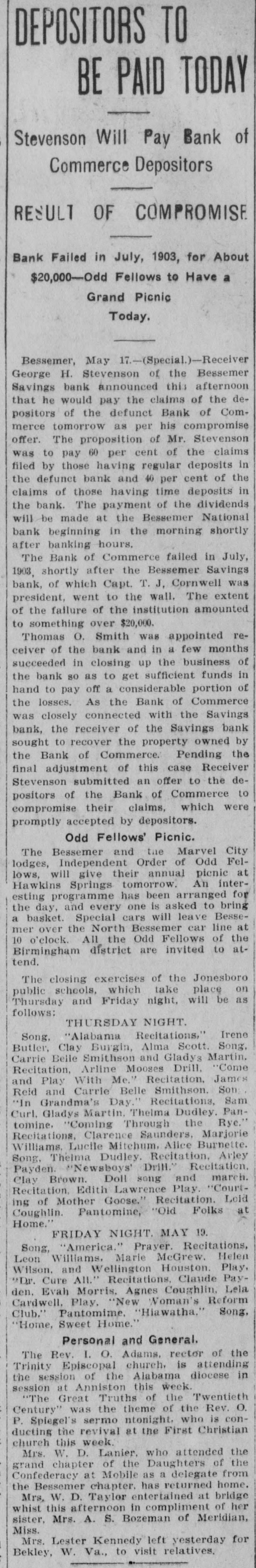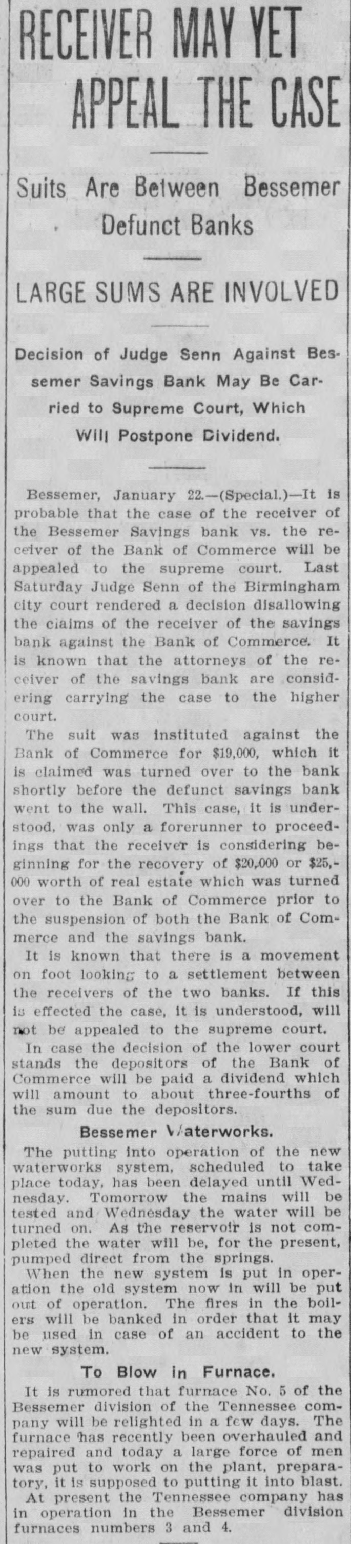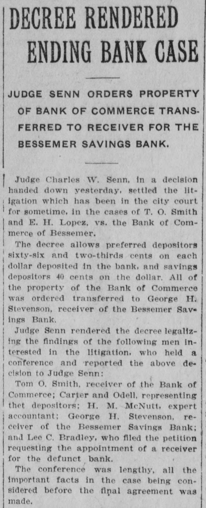 New Sensation in the Bessemer Bank Failure the HOPEFUL DEPOSITORS It Is Claimed That Cornwall Bought the Bank in Illegal Manner and That the Former Owners May Be Held Liable. Bessemer, June 13.-(Special.)-No day is without an added sensation in connection with the failure of the Bessemer Savings bank, and this was no exception to the rule. There was great rejoicing this morning when the news became known throughout town that those in charge at the bank had received $12.627, and intense curiosity was maintained as to the source from which it came, as but $760 was found in the vault when it was opened yesterday in the presence of a number of witnesses. For a time speculation was rife as to where this additional sum came from. The following statement, which was given out this afternoon, explained the matter: Statement Given Out. "On Wednesday night when the board of directors were called together, or rather met, with Cashier Cockrell they commenced an examination of the holdings of the bank. Several of the directors were large depositors; some of them to an extent that would seriously imperil their affairs and credit, if their deposits were sacrificed. They hardly knew where they stood in relation to their connection with and duty to the bank. whether it was in the nature of a trusteeship or that it would justify them in some measure to protect themselves. They found, or rather the cashier disclosed to them, some $13,000. They called in their attorney and the matter was discussed, and it was found that the aggregate of the deposits of four of the directors about equalled the funds on hand. The attorney advised that with the acquiescence of the cashier these directors take this money and hold it subject to the developments which might ensue and the determination of their rights and claims in the premises, so each director apbecame the custodian of an amount proximately equalling his deposit, as follows: W. J. Long, $7067; Sam Lefkovits, $960; A. A. Randle, $2700; J. W. Rarden, $1900, aggregating $12,627 On the determination of the receivership and the final acceptance of George H. Stevenson by all interests as the recelver, Mr. Long returned the amount in his possession to the receiver, and he was followed in this course by the other the gentlemen mentioned, returning amounts in their possession. Drop In the Bucket. While $12,000 divided among the large number of depositors of the bank will prove but a drop in the bucket, it is at least something, and serves to brighten the spirits of those who thought they might lose their all. If it is decided that the $40,000 worth of real estate mentioned among the assets of the Bank of Commerce is really the property of the Bessemer Savings bank, the situation will be still further improved for the depositors. It now looks as though a substantial dividend might be realized for the deposi- soltors; that with the cash in hand, the vent paper and the bank building and other real estate holdings, probably $45,000 to $50,000 will be secured Cockrell Talks. H. D. Cockrell, the cashier, states that it was his determination if Captain Cornwall did not return with some money on Wednesday, to close the bank Thursday, as he realized his inability to keep it runHe ning longer on the funds in hand. explains his refusal to eash the notes presented by Birmingham parties after banking hours Thursday afternoon for about it $800 by saying that he did not think right to pay out money to them then when he knew he would have to refuse payment to others the next morning. H. M. McNutt of Birmingham has been added to the force of experts at work at the bank. Mr. McNutt was formerly secretary of the Bessemer Land and Improvement company and lived here for a number of years. Banks of Commerce All Right. It was not at first generally considered probable that the Bank of Commerce would resuone business, but E. H. Lopez, the president, states that is the intention, and that he hopes this can be brought about at an early date. He adds his assurance to that of the cashier, J. H. Bemis, that the depositors will be paid in full. Captain Cornwall's present whereabouts are unknown as far as the public of Bessemer is concerned, though many theories continue to be advanced as to where he would be most likely to hide himself. Directors In Name Only. Investigation of the accounts of the bank shows that Cornwall owned the entire capital stock, and that the directors were merely directors in name only, owning no interest in the bank. They had confidence in Cornwall and simply loaned him the use of their names. The facts in the case are that about three years ago Cornwall, it is said, purchased the entire stock of the bank, amounting to $100,000. from J. N. Carpenter of Natchez, Miss., and a party or parties in New York. Cornwall paid $100.000 for the stock. The records of the bank show that at the time he paid this money he put his note in the bank for $100,000. In other words, he purchased the entire stock of the bank with the money of the depositors. This, it is said, being clearly illegal, it is possible that those depositors who have lost their funds may bring suit to recover the amount paid to the former owners of the bank stock by Cornwall. It seems that the bank was entirely a one-man concern, and that no one knew anything about its affairs except Cornwall.