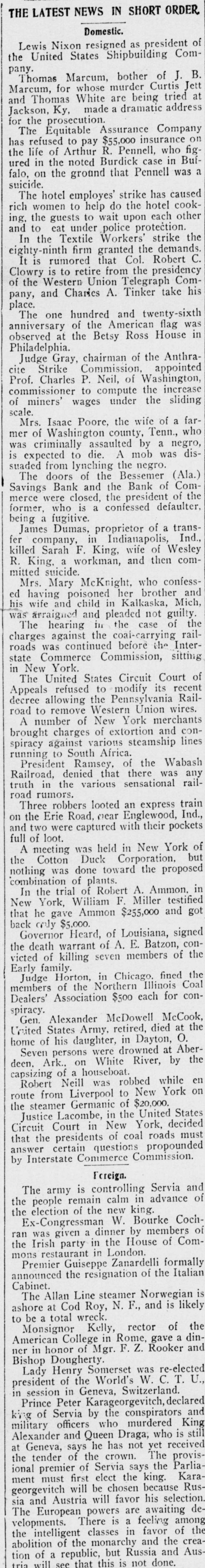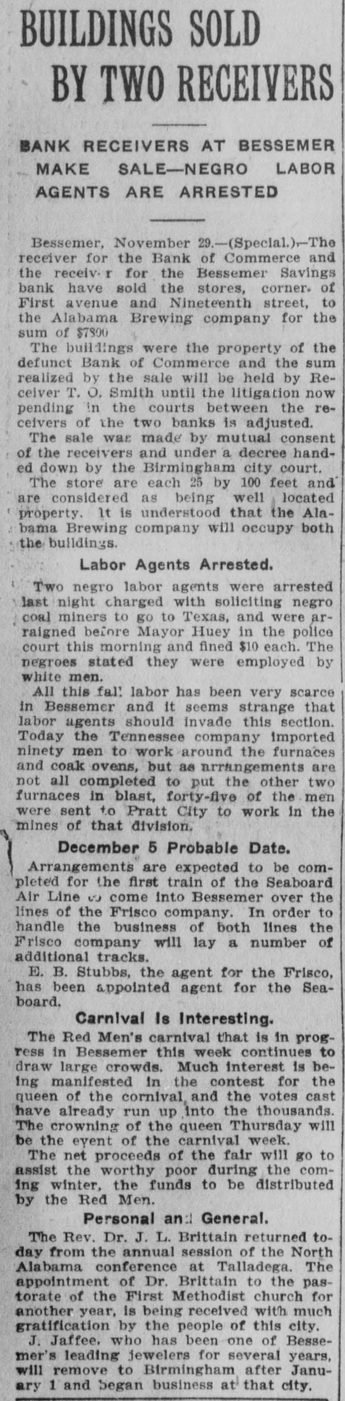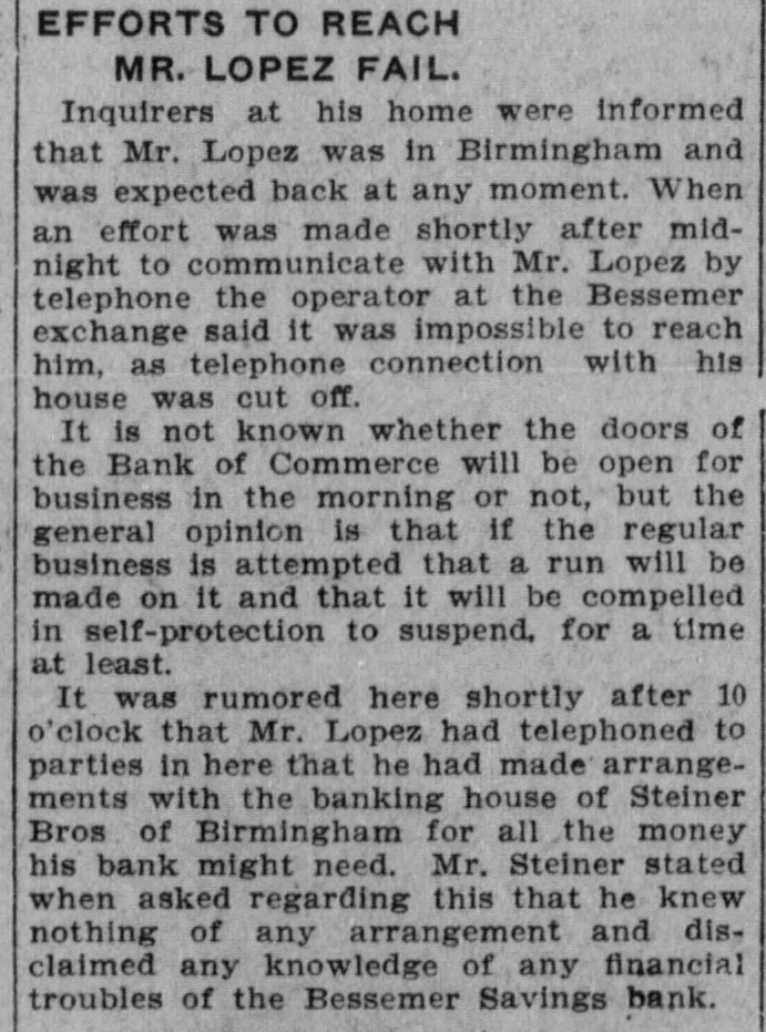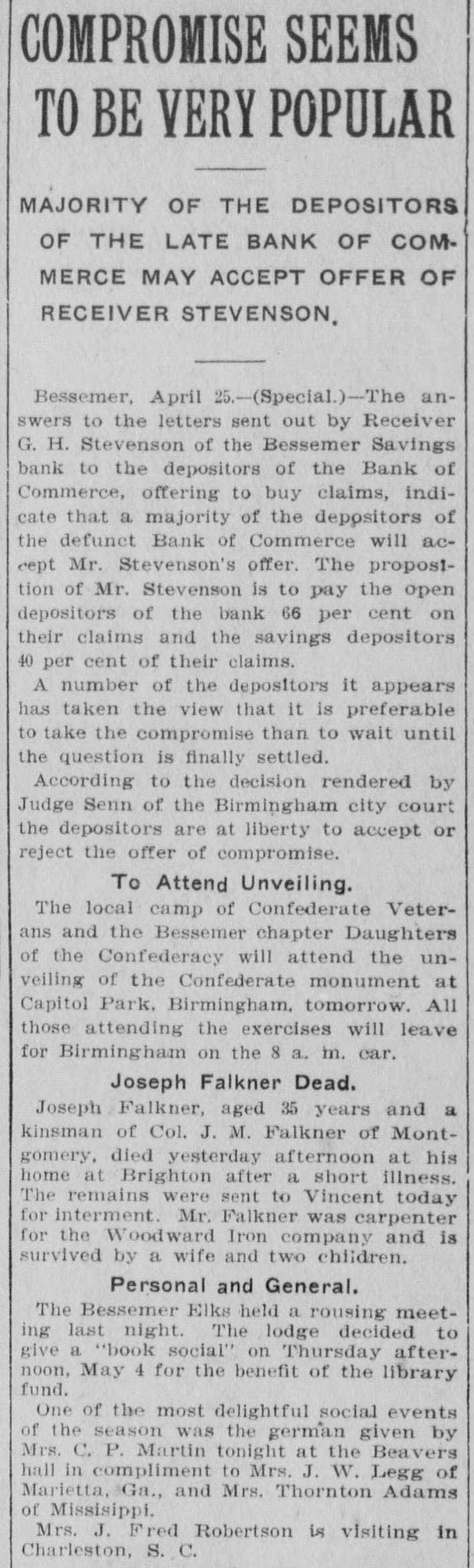 New Sensation in the Bessemer Bank Failure the HOPEFUL DEPOSITORS It Is Claimed That Cornwall Bought the Bank in Illegal Manner and That the Former Owners May Be Held Liable. Bessemer, June 13.-(Special.)-No day is without an added sensation in connection with the failure of the Bessemer Savings bank, and this was no exception to the rule. There was great rejoicing this morning when the news became known throughout town that those in charge at the bank had received $12.627, and intense curiosity was maintained as to the source from which it came, as but $760 was found in the vault when it was opened yesterday in the presence of a number of witnesses. For a time speculation was rife as to where this additional sum came from. The following statement, which was given out this afternoon, explained the matter: Statement Given Out. "On Wednesday night when the board of directors were called together, or rather met, with Cashier Cockrell they commenced an examination of the holdings of the bank. Several of the directors were large depositors; some of them to an extent that would seriously imperil their affairs and credit, if their deposits were sacrificed. They hardly knew where they stood in relation to their connection with and duty to the bank. whether it was in the nature of a trusteeship or that it would justify them in some measure to protect themselves. They found, or rather the cashier disclosed to them, some $13,000. They called in their attorney and the matter was discussed, and it was found that the aggregate of the deposits of four of the directors about equalled the funds on hand. The attorney advised that with the acquiescence of the cashier these directors take this money and hold it subject to the developments which might ensue and the determination of their rights and claims in the premises, so each director apbecame the custodian of an amount proximately equalling his deposit, as follows: W. J. Long, $7067; Sam Lefkovits, $960; A. A. Randle, $2700; J. W. Rarden, $1900, aggregating $12,627 On the determination of the receivership and the final acceptance of George H. Stevenson by all interests as the recelver, Mr. Long returned the amount in his possession to the receiver, and he was followed in this course by the other the gentlemen mentioned, returning amounts in their possession. Drop In the Bucket. While $12,000 divided among the large number of depositors of the bank will prove but a drop in the bucket, it is at least something, and serves to brighten the spirits of those who thought they might lose their all. If it is decided that the $40,000 worth of real estate mentioned among the assets of the Bank of Commerce is really the property of the Bessemer Savings bank, the situation will be still further improved for the depositors. It now looks as though a substantial dividend might be realized for the deposi- soltors; that with the cash in hand, the vent paper and the bank building and other real estate holdings, probably $45,000 to $50,000 will be secured Cockrell Talks. H. D. Cockrell, the cashier, states that it was his determination if Captain Cornwall did not return with some money on Wednesday, to close the bank Thursday, as he realized his inability to keep it runHe ning longer on the funds in hand. explains his refusal to eash the notes presented by Birmingham parties after banking hours Thursday afternoon for about it $800 by saying that he did not think right to pay out money to them then when he knew he would have to refuse payment to others the next morning. H. M. McNutt of Birmingham has been added to the force of experts at work at the bank. Mr. McNutt was formerly secretary of the Bessemer Land and Improvement company and lived here for a number of years. Banks of Commerce All Right. It was not at first generally considered probable that the Bank of Commerce would resuone business, but E. H. Lopez, the president, states that is the intention, and that he hopes this can be brought about at an early date. He adds his assurance to that of the cashier, J. H. Bemis, that the depositors will be paid in full. Captain Cornwall's present whereabouts are unknown as far as the public of Bessemer is concerned, though many theories continue to be advanced as to where he would be most likely to hide himself. Directors In Name Only. Investigation of the accounts of the bank shows that Cornwall owned the entire capital stock, and that the directors were merely directors in name only, owning no interest in the bank. They had confidence in Cornwall and simply loaned him the use of their names. The facts in the case are that about three years ago Cornwall, it is said, purchased the entire stock of the bank, amounting to $100,000. from J. N. Carpenter of Natchez, Miss., and a party or parties in New York. Cornwall paid $100.000 for the stock. The records of the bank show that at the time he paid this money he put his note in the bank for $100,000. In other words, he purchased the entire stock of the bank with the money of the depositors. This, it is said, being clearly illegal, it is possible that those depositors who have lost their funds may bring suit to recover the amount paid to the former owners of the bank stock by Cornwall. It seems that the bank was entirely a one-man concern, and that no one knew anything about its affairs except Cornwall.