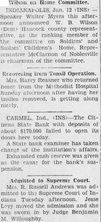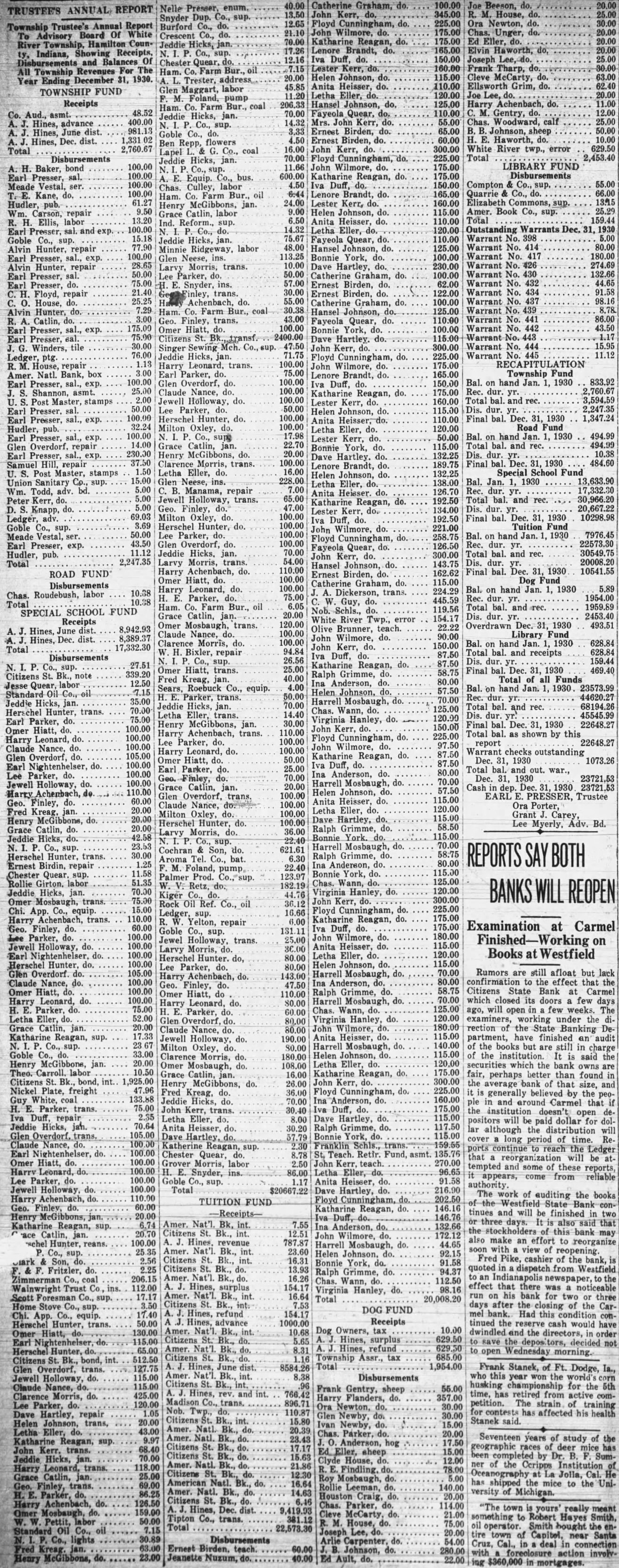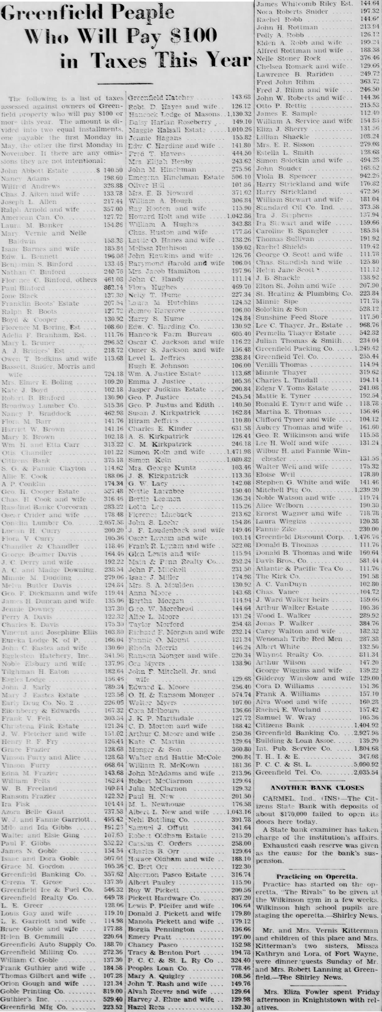 Peaple Will Pay Taxes This Year in following list of taxes against owners of Greenfield who will $100 property pay The amount is vided two equal installments. payable the first Monday the first Monday November there are any omisintentional: Abbott Estate Nancy Adams 198.60 Andrews 328.88 Chas wife 133.78 Joseph Allen 217.44 Ralph Arnold and wife 357.00 American Can Co 127.72 Laura M Banker 154.86 Mary Vernie and Nelle Baldwin 158.38 Isaac Barnes wife 185.84 Edw Bennett 196.06 Binford Nathan Binford 240.76 others 461.08 Paul Binford 862.14 Ione Black 137.30 Franklin Boots' Estate 207.54 Ralph Boots Boyd Cooper 130.92 Florence Boring Est 108.60 Adelia Est. 111.76 Mary Bruner 296.52 Bridges Est 218.72 Owen Bodkins and 113.68 Bassett. Snider. Morris and wife Boling Kate Boyd Binford Broadway Lumber Co Nancy Braddock Barr Harriet Brown Mary Brown Etta Carr Otis Chandler Citizens Bank Fannie Clayton Cook Conklin Geo Cooper Estate Chas Cook and wife Banke Corcoran Oscar Crider and wife Lumber Co Lucian Curry Flora Curry Chandler Chandler George Beamer Davis Derry and wife Madge Downing Minnie Dudding Melva Butler Davis Dickmann and wife James Duncan and wife Jennie Downey Perry Davis Charles Davis Vincent Josephine Ellis Eureka Lodge and wife Egglesten Noble Elsbury wife Tilghman H. Eaton Eagles Lodge John Early Mary Eastes Estate Early Drug No. Edwards Frank Felt Fink Estate Fletcher and wife Henry Fry Grace Frazier Vinson and Alice Vinson Furry Edna Frazier William Felts Freeland Ransom Frazier Fisk Azora Belle Gant and Fannie Garriott Milo and Ida Gibbs Walter and Elsie Ging Paul Gibbs James N. Goble Isaac Dora Goble Grace M. Gordon Greenfield Banking Co. Cerena Grose Greenfield Ice & Fuel Co. Greenfield Realty Co. L. Greer Louis Gay and wife Garriott and wife Bruce Goble and wife Helen Gemmill Greenfield Auto Supply Co. Greenfield Milling Co. William C. Goble Frank Guthier and wife Thomas Gilbert and wife Orion Gough and wife Goble Printing Co. Guthier's Inc. Greenfield Mfg Co. and Robt Hayes and wife Lodge of Masons Harlan Roseberry Maggie Halsall Estate Jennie Hagans Edw Harding Havens Mrs Elijah Henby John Hinchman Hinchman Estate Oliver Howard William Hough Ray Hooten and wife Howard Holt and wife William A Hughes Chas. Huston and wife Hanes and wife Melissa Huthison John Hawkins and wife Harold and wife Jacob Hamilton John C. Handy Flora Hughes Hume M Hutchins Hargrove Harry S. Hume Edw. C. Harding Co. Hancock Farm Bureau Oscar Jackson and Omer Jackson and Level Jeffries Hugh Johnson 724.18 Wm. Justice Estate 109.20 Emma Justice 102.18 Jasper Judkins Estate 130.90 Geo. Justice 515.36 Justus and Edith 462.98 Susan Kirkpatrick 141.76 Hiram Jeffries 141.16 Charles Kinder 102.18 Kirkpatrick 313.22 Kirkpatrick Simon Koin and wife 375.18 Simon 114.62 Mrs. George Kuntz 188.06 Kirkpatrick 174.34 Lacy 527.48 Nettle Larrabee 316.46 Leamon 283.22 Lotta Lee 178.48 Lineback 2,057.58 John 200.20 Loudenback and 105.36 Lynam and wife 118.46 Lynam and wife 164.46 Glon Lewis and wife 192.22 & Realty 238.54 John Mitchell 279.06 Miller 124.84 Moulden 119.44 Anna Moore 135.06 Morgan 137.30 Morehead 122.32 Alice Moore 175.30 Taylor Morford 103.80 Morgan and 166.04 Mount 130.60 Rhoda Morris 341.98 Ransom Monger and wife 137.96 Ora Myers 182.64 John Jr. and 156.46 wife 789.34 Edward Moore 123.56 Ransom 226.05 Walter Myers 167.32 Cora Melbourn 303.34 Martindale 121.34 Morton and 151.02 Arthur Moore and wife 126.41 Kate Martin 128.68 Monger & Son 128.68 Walter and Hattie McCole 668.64 William R. McKown 143.68 John McAdams and 162.84 Robert McCiarnon 109.84 Julia McClarnon 143.68 126.12 1,130.32 149.10 1,010.26 155.82 141.80 444.50 Estella 243.62 Simon 275.56 John 506.10 Viola 101.86 Harry 371.02 Harry James Whitcomb Riley Est. Nora Roberts Snider 197.32 Rachel Robb 144.64 John H. Rottman 213.94 Robb 126.12 Polly Elden Robb and 199.24 Alfred Rottman and wife 188.38 Nelle Stoner Rock 376.46 Chelsea Romack and wife 129.66 Lawrence B. Rariden 249.72 Fred John Rihm 363.72 Fred Rihm and wife 246.50 John Roberts and wife 144.36 Otto Rettig 215.53 James E. Sample 112.40 William Service and wife 154.86 Eliza Sherry 131.56 Lillian Shackle 108.24 Sisson 279.08 Smith 128.68 Solotkin and wife 494.28 Souder 168.62 B Spencer 942.26 Strickland and wife 170.82 Strickland 472.56 William Stewart and wife 181.04 306.84 Standard Oil Co. Ind. 373.58 115.90 Ira Stephens 137.94 1,042.86 and wife 159.66 343.88 177.86 Caroline Spangler 185.84 138.26 Thomas Sullivan 191.92 Rachel Shields 119.42 159.02 George Scott and wife 111.78 126.76 106.04 Standish and wife 125.80 Helen Jane Scott 111.12 197.96 111.14 Shackle 138.92 129.68 Elton and wife 207.90 469.70 Heating & Plumbing Co. 223.84 227.34 Minnie Sipe 171.78 124.52 106.00 Solotkin Son 528.12 Sunshine Feed Store 117.50 124.84 130.92 Lee Thayer. Estate 968.76 605.40 Permelia Thayer Estate 542.82 116.22 Julian Thomas Smith 234.04 Greenfield Packing Co. 1,249.42 156.48 Greenfield Co. 255.44 238.84 106.00 Venilli Thomas 114.94 113.68 Minnie Thayer 319.62 105.36 Charles Tindall 194.14 Edgar Toms Estate 241.08 200.84 245.54 Mattie Tyner 192.54 140.50 Ronald Tyner and wife 118.78 162.84 Martha Thomas 156.46 110.80 Clifford Tyner and wife 104.12 631.58 Aubrey Thomas and wife 161.60 126.44 Geo R Wilkinson and wife 115.58 246.18 Lee H. Wolf and wife 131.24 1,471.98 Wilbur H. and Fannie Win1,080.82 chester 103.46 Walter Weil and wife 175.32 113.36 Eloise Weil 178.80 142.08 Stephen G. White and wife 141.46 150.40 Mitchell Ptg Co. 1,239.20 136.34 Noble Watson and wife 119.74 115.26 Alice Welborn 190.30 213.62 Ernest Wagner and wife 718.78 154.86 Laura Wiggins 120.38 149.46 Fannie Zike 230.00 103.14 Greenfield Discount Corp. 1,476.76 522.08 Donald Thomas 111.76 115.94 Donald B. Thomas and wife 160.64 252.24 Davis Co. 581.44 231.50 Atlantic Pacific Tea 111.76 174.98 The Kirk Co. 191.58 130.92 VanDuyn 102.80 143.68 Vance 104.72 114.94 Ward Walker heirs 159.66 144.64 Arthur Walker Estate 105.36 131.24 W