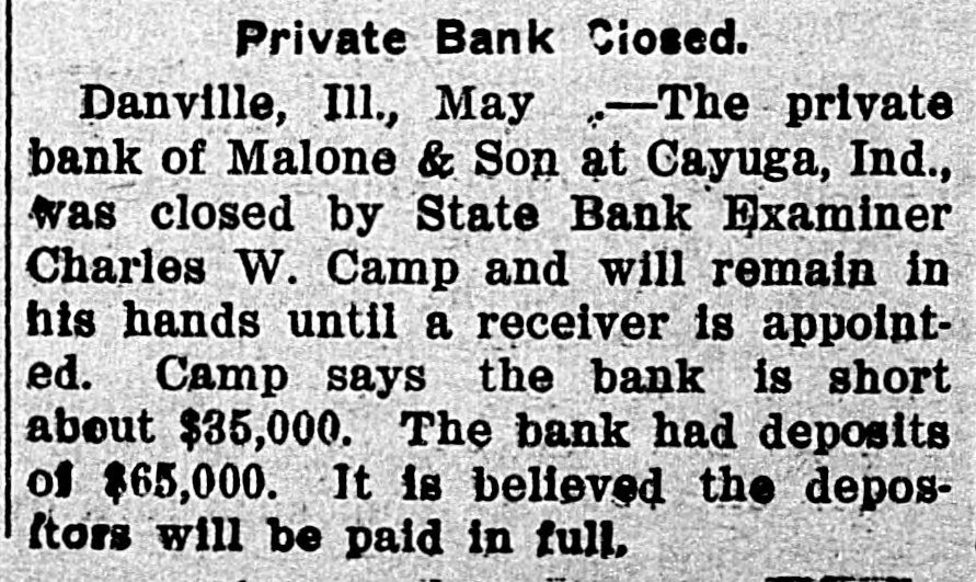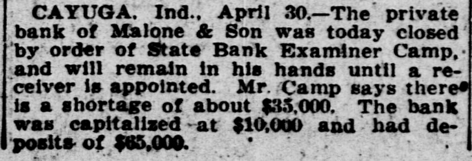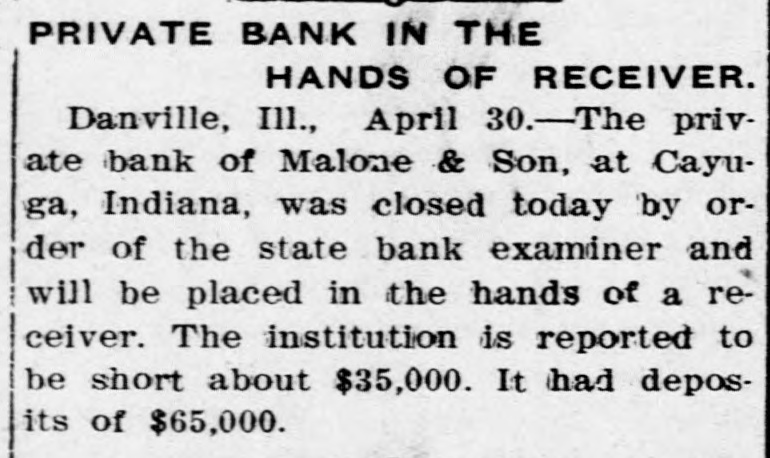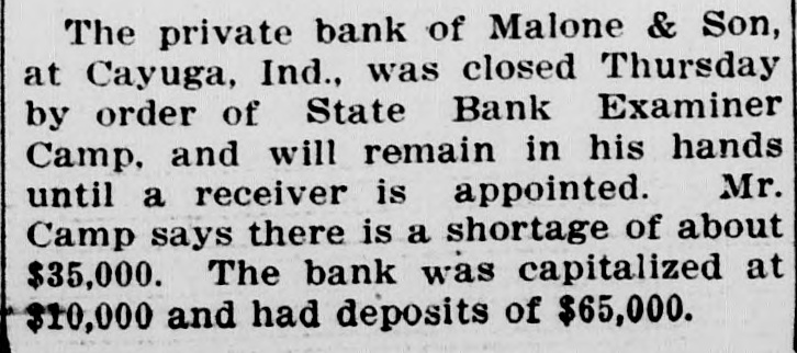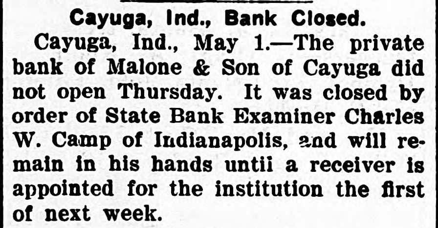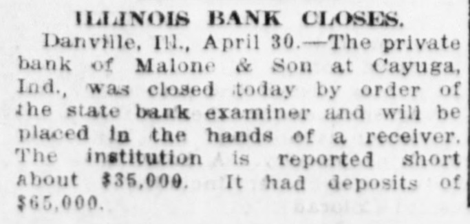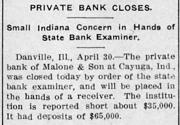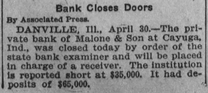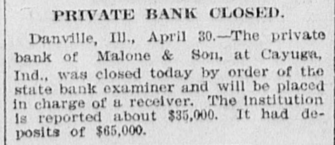 The private bank of Malone & Son of Cayuga, Ind., was closed by the state bank examiner.