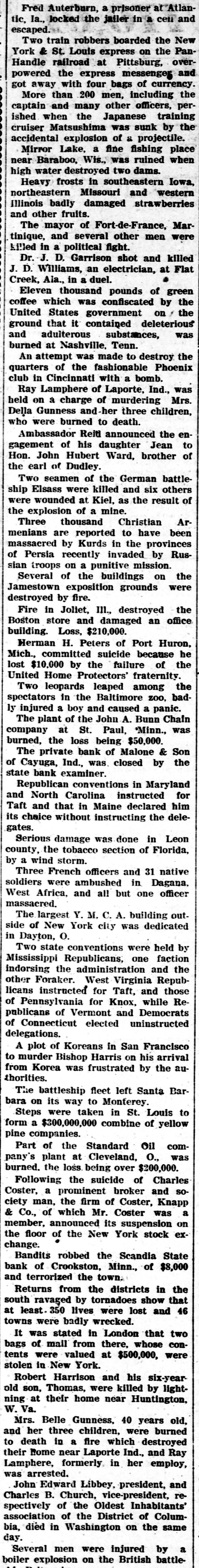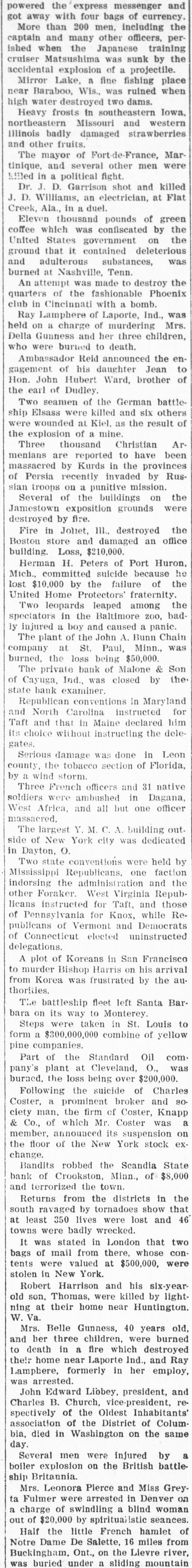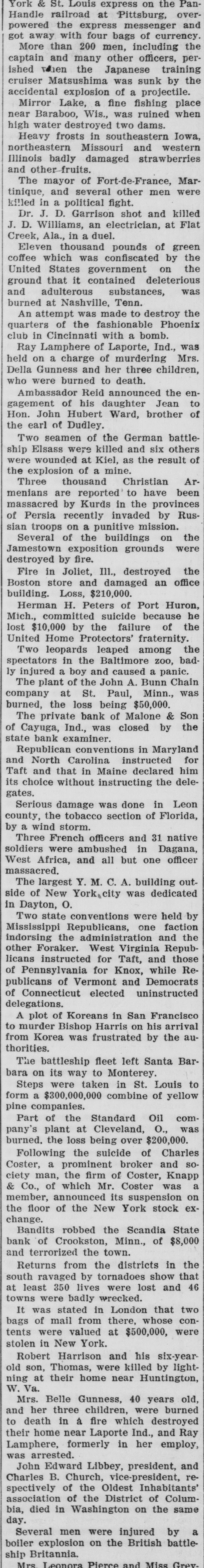 Mrs. Belle Gunness, 40 years old, and her three children, were burned to death in a fire which destroyed their home near Laporte Ind., and Ray Lamphere, formerly in her employ, was arrested.