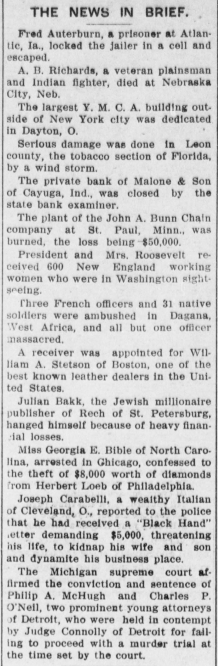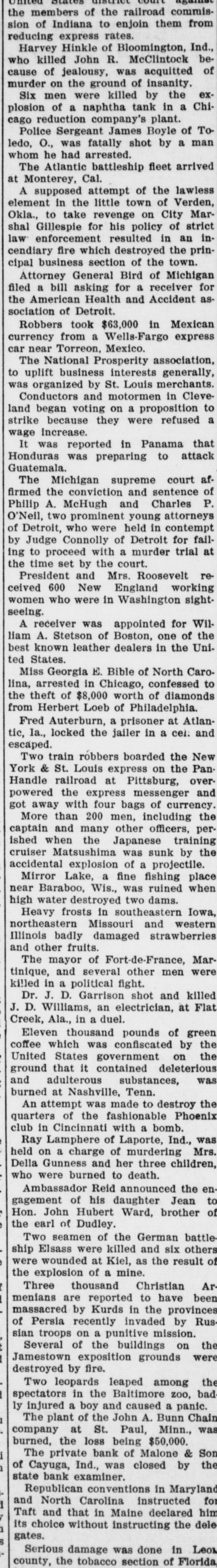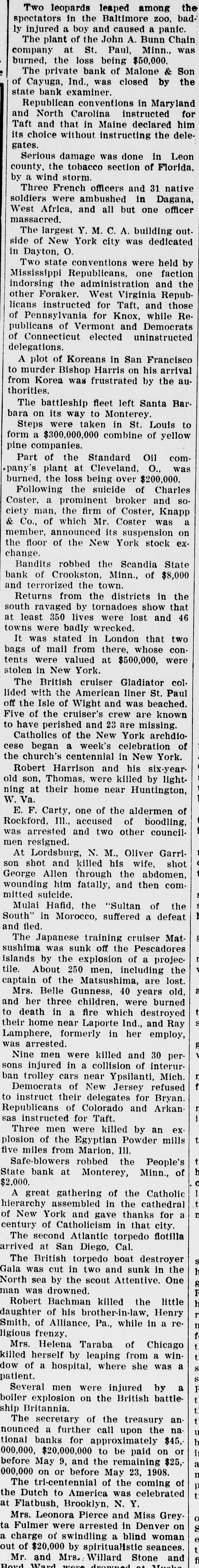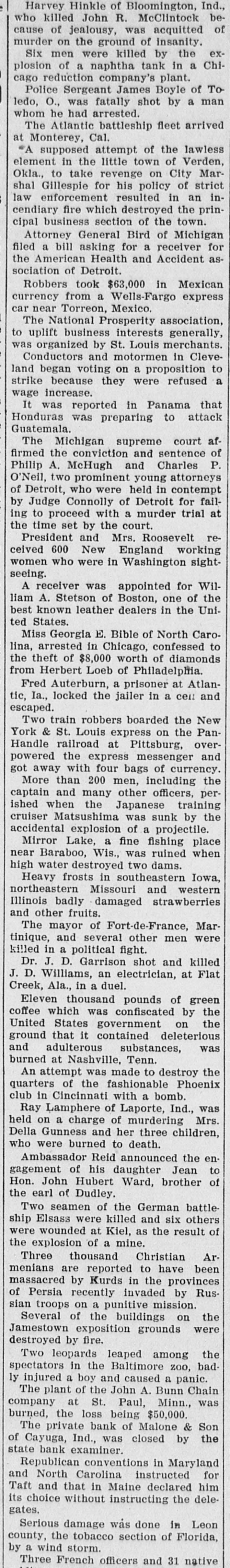 Mrs. Belle Gunness, 40 years old, and her three children, were burned to death in a fire which destroyed their home near Laporte Ind., and Ray Lamphere, formerly in her employ, was arrested.