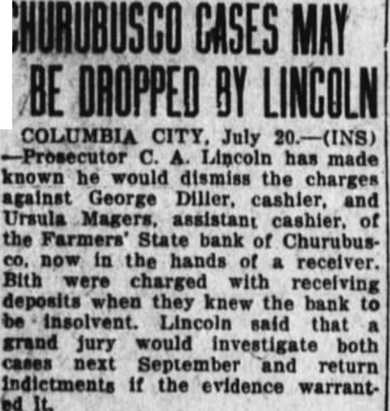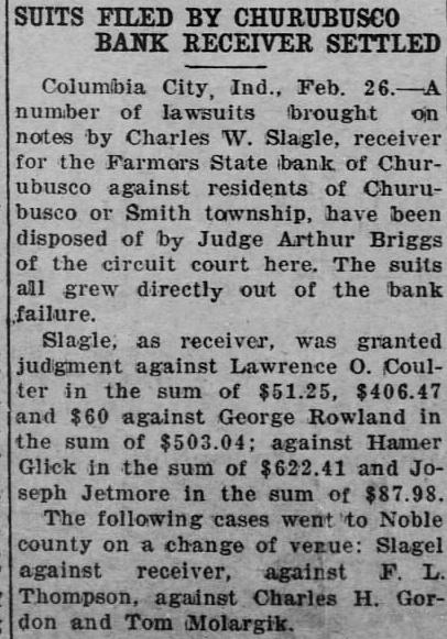SUITS FILED BY CHURUBUSCO BANK RECEIVER Columbia City, Ind., Feb. number lawsuits brought by Charles Slagle, for the Farmers State bank of ubusco against residents of Churubusco Smith township, have been disposed of by Judge Arthur Briggs the circuit court here. The suits all grew directly out of the bank failure. Slagle, as receiver, was granted judgment against Lawrence Coulin the sum of $51.25, $60 against George Rowland the of against Hamer Glick in the sum of and seph Jetmore in the The following cases Noble county on change of verue: Slagel against receiver, against Thompson, against Charles H. don and Tom Molargik.