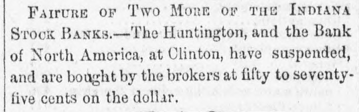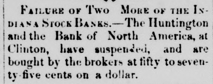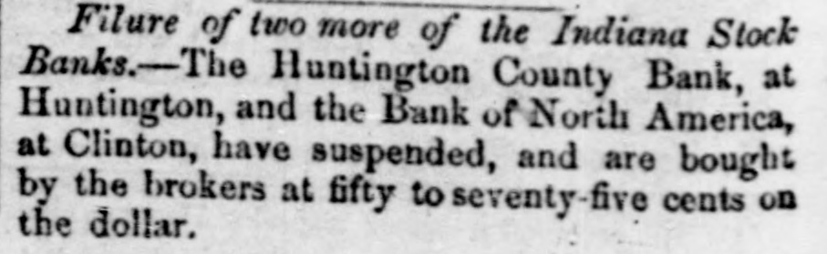 Filure of two more of the Indiana Stock Banks.-The Huntington County Bank, at Huntington, and the Bank of North America, at Clinton, have suspended, and are bought by the brokers at fifty to seventy-five cents on the dollar.