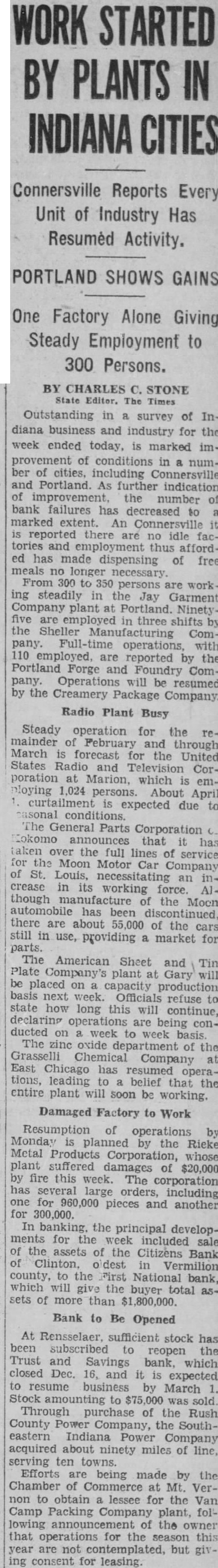 WORK STARTED BY PLANTS IN INDIANA CITIES Connersville Reports Every Unit of Industry Has Resumed Activity. PORTLAND SHOWS GAINS One Factory Alone Giving Steady Employment to 300 Persons. BY CHARLES STONE State Editor. The Outstanding in survey of Indiana business and industry for the week ended today, is marked improvement of conditions in a number of cities, Connersville and Portland. As further indication improvement, the number of bank failures has decreased marked extent An Connersville it there are no idle and ed has made dispensing of free 300 350 persons working steadily in the Jay Garment plant Ninety in three shifts by the Sheller ComFull-time operations, with 110 employed. are reported by the Portland Forge and Foundry Company. Operations will be resumed the Creamery Package Company. Radio Plant Busy Steady operation for the remainder February and through March forecast for the United States Radio and Television Corporation at Marion, which is em1,024 persons. About April curtailment is expected due to The General Parts Corporation that has taken over the of service for Moon Motor Car Company Louis, an crease in its working though the Moon has there are about of the cars still in use, providing market for parts. The American Sheet and Plate Company's plant at Gary placed capacity production basis next week. Officials refuse to state how long this will continue, declaring operations are being conducted on week week The oxide department of the Grasselli Chemical Company East Chicago has resumed operations, leading to that entire plant soon be working. Damaged Factory to Work Resumption of operations by Monday by the Ricke Metal Products Corporation, whose plant suffered damages $20,000 fire this week. The corporation has large including for 960,000 pieces and another for 300,000. In banking. the principal developments for the week included the assets of the Citizens Bank Clinton, Vermilion county, to the First National bank, which will give the buyer total assets of more than $1,800,000. Bank to Be Opened At Rensselaer, sufficient stock has been to reopen the Trust and Savings bank, which closed 16, and it is expected to resume by March to purchase of the Rush County the South eastern Indiana Power acquired about ninety miles of line serving ten Efforts are being made by the Chamber of Mt. Verto obtain lessee for the Van Camp Packing Company plant, folthe that operations for the this are not but ing consent for leasing