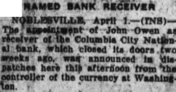 NAMED BANK RECEIVER April The appointment of John Owen receiver of Columbia City Nationat bank. which closed its doors two weeks ago, was announced in patches here this afternoon from controller of the currency at Washing ton.