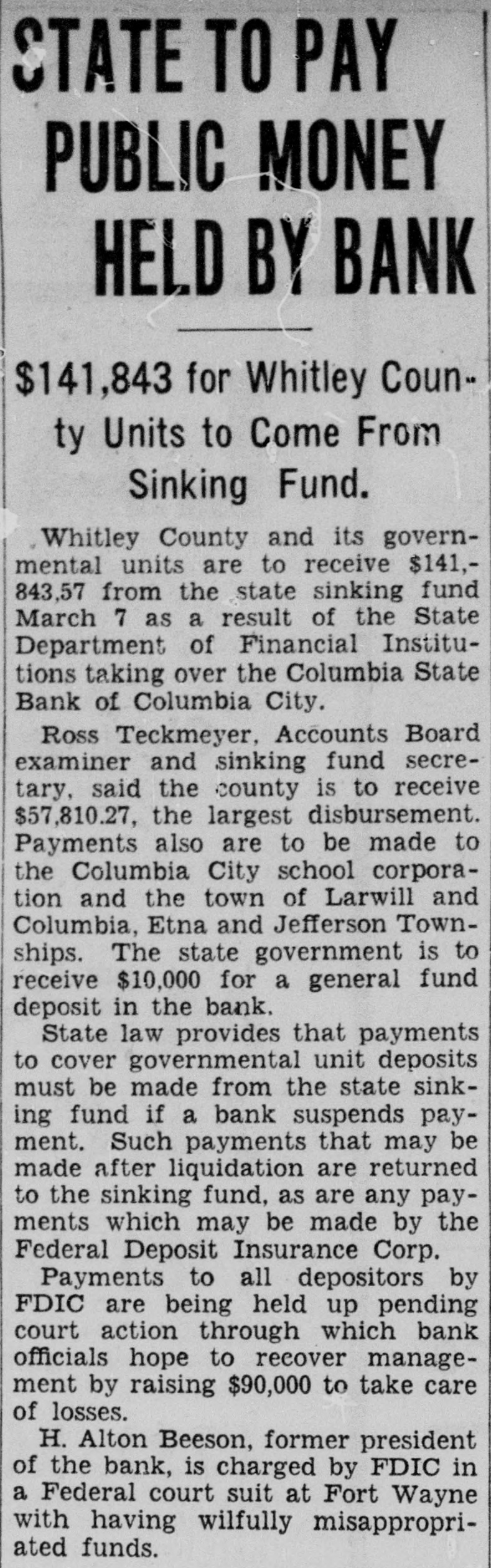 STATE TO PAY PUBLIC MONEY HELD BY BANK $141,843 for Whitley County Units to Come From Sinking Fund. Whitley County and its governmental units are to receive $141,843,57 from the state sinking fund March 7 as a result of the State Department of Financial Institutions taking over the Columbia State Bank of Columbia City. Ross Teckmeyer, Accounts Board examiner and sinking fund secretary, said the county is to receive $57,810.27, the largest disbursement. Payments also are to be made to the Columbia City school corporation and the town of Larwill and Columbia, Etna and Jefferson Townships. The state government is to receive $10,000 for a general fund deposit in the bank. State law provides that payments to cover governmental unit deposits must be made from the state sinking fund if a bank suspends payment. Such payments that may be made after liquidation are returned to the sinking fund, as are any payments which may be made by the Federal Deposit Insurance Corp. Payments to all depositors by FDIC are being held up pending court action through which bank officials hope to recover management by raising $90,000 to take care of losses. H. Alton Beeson, former president of the bank, is charged by FDIC in a Federal court suit at Fort Wayne with having wilfully misappropriated funds.