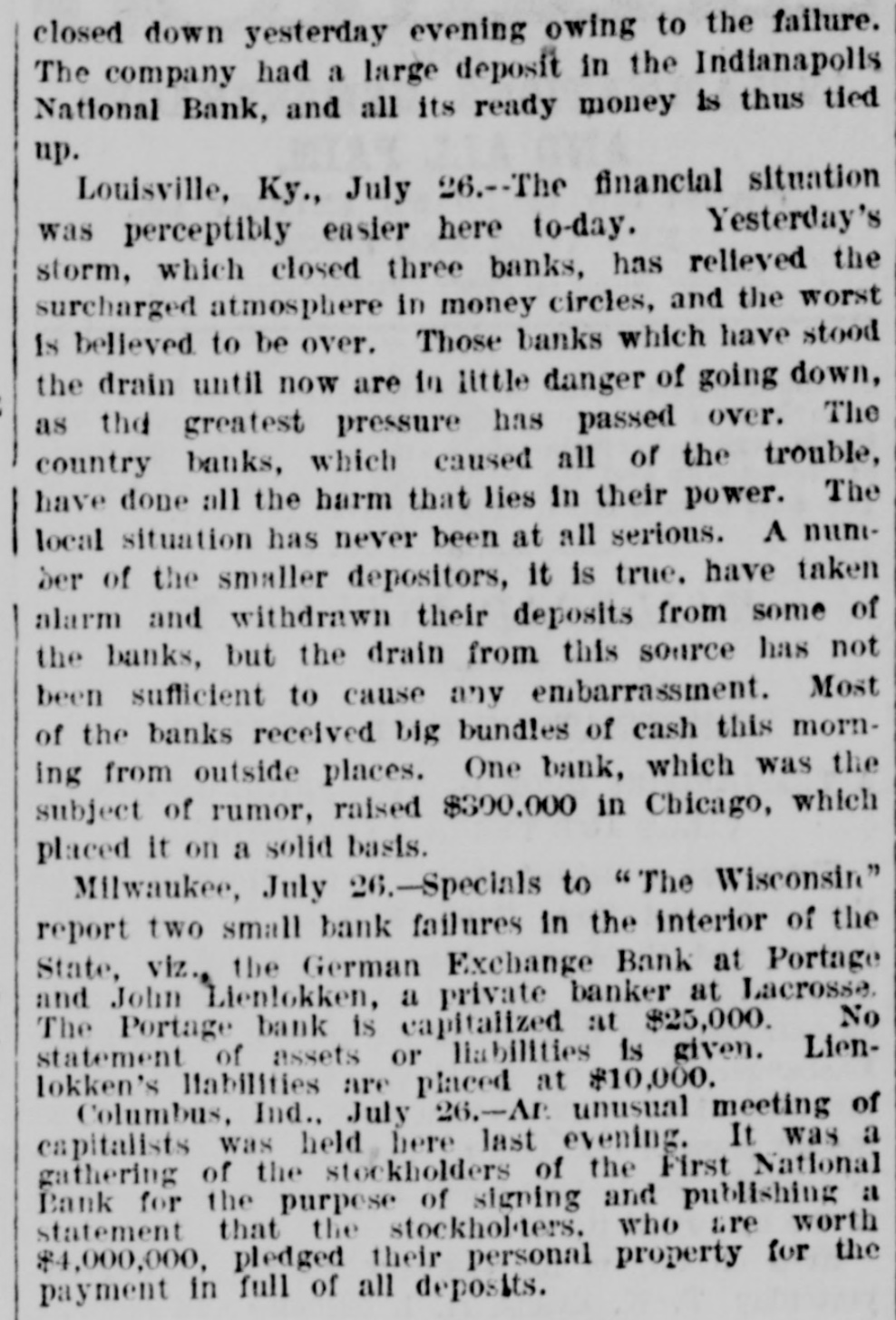 closed down yesterday evening owing to the failure. The company had a large deposit in the Indianapolis National Bank, and all its ready money is thus tied up. Louisville, Ky., July 26.--The financial situation was perceptibly easier here to-day. Yesterday's storm, which closed three banks, has relleved the surcharged atmosphere in money circles, and the worst is believed to be over. Those banks which have stood the drain until now are in little danger of going down, as the greatest pressure has passed over. The country banks, which caused all of the trouble, have done all the harm that lies in their power. The local situation has never been at all serious. A nunber of the smaller depositors, it is true. have taken alarm and withdrawn their deposits from some of the banks, but the drain from this source has not been sufficient to cause any embarrassment. Most of the banks received big bundles of cash this morning from outside places. One bank, which was the subject of rumor, raised $300,000 in Chicago, which placed It on a solid basis. Milwaukee, July 26.-Specials to "The Wisconsin" report two small bank failures in the interior of the State, viz., the German Exchange Bank at Portage and John Lienlokken, a private banker at Lacrosse. The Portage bank is capitalized at $25,000. No statement of assets or liabilities is given. Lienlokken's liabilities are placed at $10,000. Columbus, Ind., July 26.-AP unusual meeting of capitalists was held here last evening. It was a gathering of the stockholders of the First National Bank for the purpose of signing and publishing a statement that the stockholders. who are worth $4,000,000, pledged their personal property for the payment in full of all deposits.