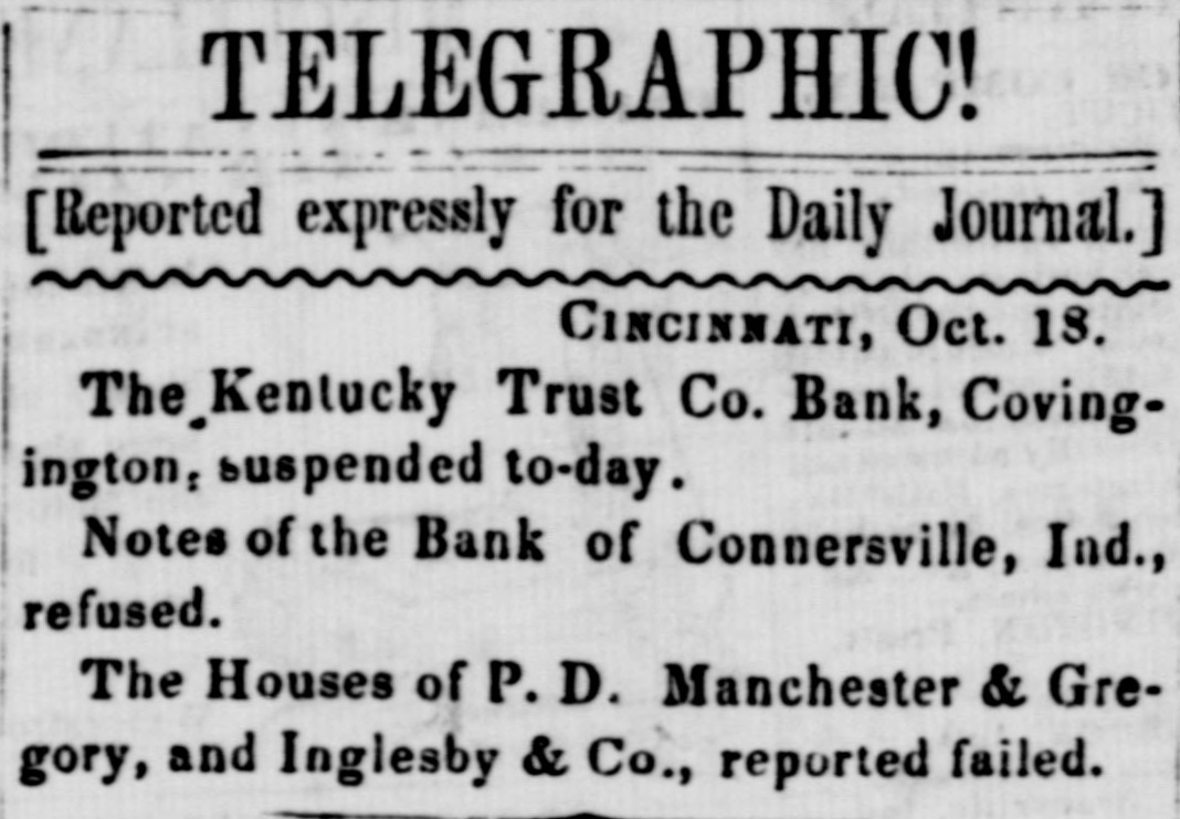 TELEGRAPHIC! [ Reported expressly for the Daily Journal.] CINCINNATI, Oct. 13. The Kentucky Trust Co. Bank, Covingington, suspended to-day. Notes of the Bank of Connersville, Ind., refused. The Houses of P. D. Manchester & Gregory, and Inglesby & Co., reported failed.