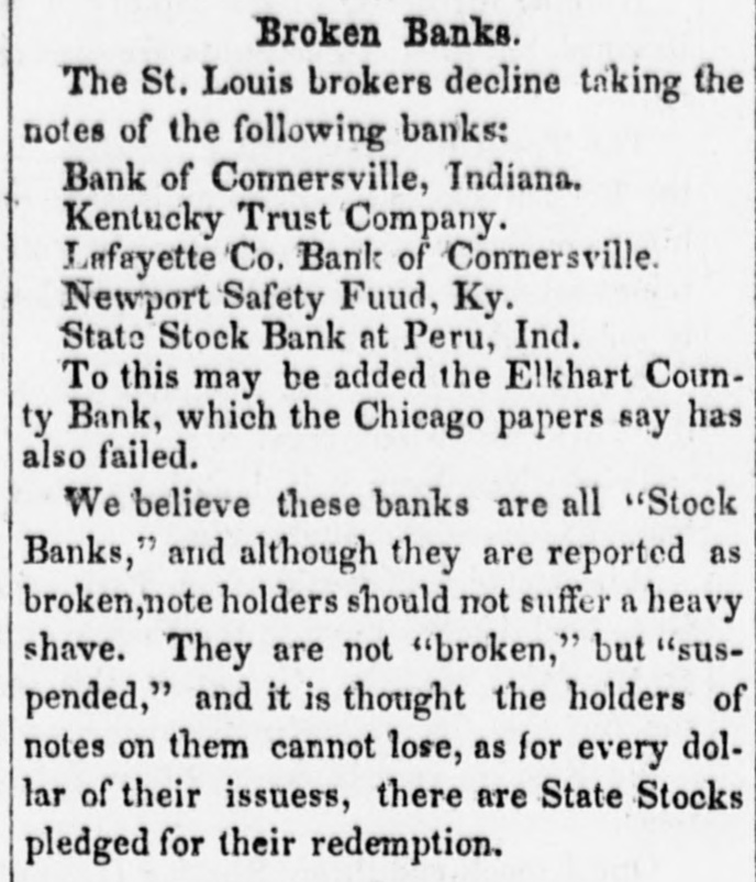 Broken Banks. The St. Louis brokers decline taking the notes of the following banks: Bank of Connersville, Indiana. Kentucky Trust Company. Lafayette Co. Bank of Connersville. Newport Safety Fund, Ky. State Stock Bank at Peru, Ind. To this may be added the Elkhart County Bank, which the Chicago papers say has also failed. We believe these banks are all "Stock Banks," and although they are reported as broken, note holders should not suffer a heavy shave. They are not "broken," but "suspended," and it is thought the holders of notes on them cannot lose, as for every dollar of their issuess, there are State Stocks pledged for their redemption.