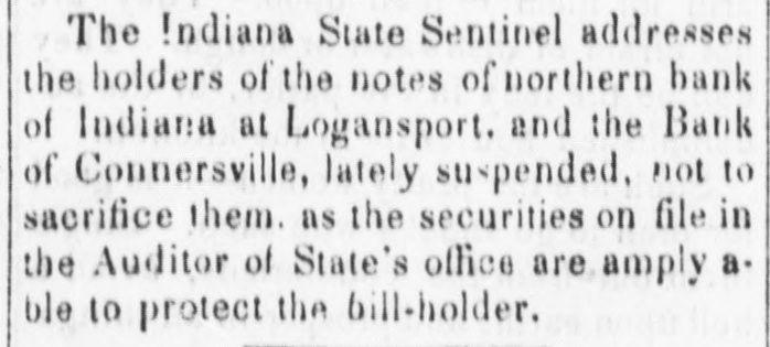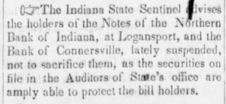 The Indiana State Sentinel diveses the holders of the Notes of the Northern Bank of Indiana, at Logansport, and the Bank of Connersville, lately suspended, not to sacrifice them, as the securities on file in the Auditors of State's office are amply able to protect the bill holders.