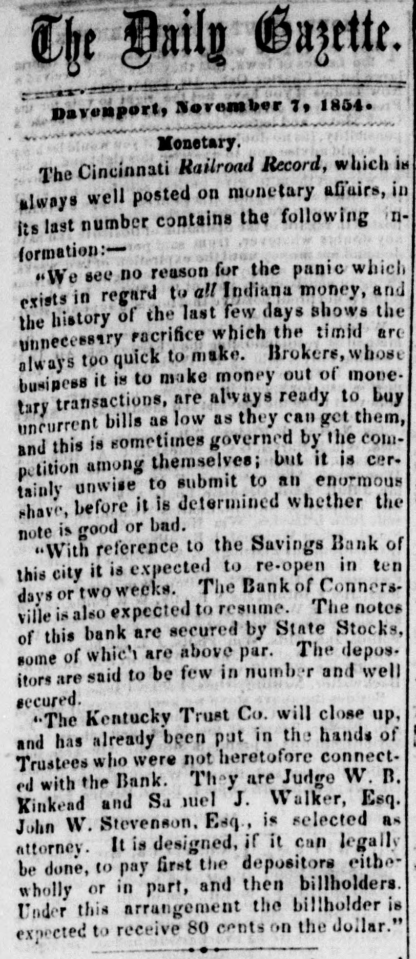 The Daily Bazette. Davenport, November 7, 1854. Monetary. The Cincinnati Railroad Record, which is always well posted on monetary affairs, in its last number contains the following nformation:"We see no reason for the panic which exists in regard to all Indiana money, and the history of the last few days shows the unnecessary Facrifice which the timid are always too quick to make. Brokers, whose business it is to make money out of monetary transactions, are always ready to buy uncurrent bills as low as they can get them, and this is sometimes governed by the competition among themselves; but it is certainly unwise to submit to an enormous shave, before it is determined whether the note is good or bad. "With reference to the Savings Bank of this city it is expected to re-open in ten days or two weeks. The Bank of Connersville is also expected to resume. The notes of this bank are secured by State Stocks, some of which are above par. The depos. itors are said to be few in number and well secured. "The Kentucky Trust Co. will close up, and has already been put in the hands of Trustees who were not heretofore connected with the Bank. They are Judge W. B. Kinkead and Sa uel J. Walker, Esq. John W. Stevenson, Esq., is selected as attorney. It is designed, if it can legally be done, to pay first the depositors either wholly or in part, and then billholders. Under this arrangement the billholder is expected to receive 80 cents on the dollar."