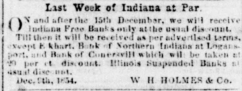 Last Week of Indiana at Par. N and after the 15th December, we will receive 0 Indiana Free Banks only atthe usual discount. Till then it will be received as per advertised terms, except E khart. Bank of Northern Indiana at Logansport, and Bank of Conersvill which wil: be taken at 90 per et. discount. Illinois Suspended Banks BI asual discount. W H.HOLMES & Co. Dec. Sth, 1834.