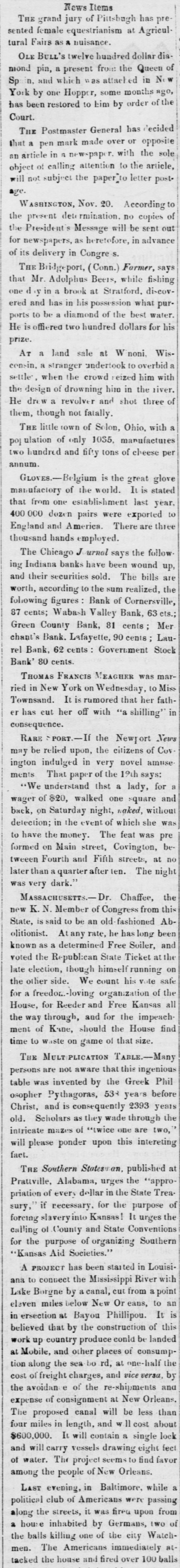 Sp n. and which was attached in No York by one Hopper, some months ago, has been restored to him by order of the Court. THE Postmaster General has decided that a pen mark made over or opposite an article in a newspaper with the sole object of calling attention to the article, will not subject the paper to letter postage. WASHINGTON, Nov. 20. According to the present dete rmination. no copies of the President's Message will be sent out for newspapers, as heretofore, in advance of its delivery in Congre THE Bridgeport, (Conn.) Farmer, says that Mr. Adolphus Beers, while fishing one y in a brook at Stratford, discovered and has in his possession what purports to be a diamond of the best water. He is officred two hundred dollars for his prize. AT a land sale at W noni, Wisconsin, a stranger undertook to overbid a settle, when the crowd reized him with the design of drowning him in the river. He dre a revolver and shot three of them, though not fatally. THE little town of Solon, Ohio, with a Pol ulation of only 1035, manufactures two hundred and fifty tons of cheese per annum. GLOVES.-Belgium is the great glove manufactory of the world. It is stated that from one establishment last year, 400 000 dozen pairs were exported to England and America. There are three thousand hands employed. The Chicago J urnal says the follow. ing Indiana banks have been wound up, and their securities sold. The bills are worth, according to the sum realized, the following figures Bank of Cornersville, 87 cents; Wabash Valley Bank, 63 cts.; Green County Bank, 81 cents; Mer chant's Bank. Lafayette, 90 cents ; Laurel Bank, 62 cents Government Stock Bank' 80 cents. THOMAS FRANCIS MEAGHER was married in New York on Wednesday, to Miss Townsand. It is rumored that her father has cut her off with "a shilling" in consequence. RARE PORT.-If the Newport News may be relied upon, the citizens of Cov. ington indulged in very novel amuse ments That paper of the 19th says: "We understand thst a lady, for a wager of $20, walked one square and back, on Saturday night, maked, without detection; in the event of which she was to have the money. The feat was pre formed on Main street, Covington, betweeen Fourth and Fifth streets, at no later than a quarter after ten. The night was very dark." MASSACHUSETTS.-Dr. Chaffee, the new K.N. Member of Congress from this State, is said to be an old fashioned Abolitionist. At any rate, he has long been known as a determined Free Soiler, and voted the Republican State Ticket at the late election, though himself running on the other side. We count his vote safe for a freedom-loving organization of the House, for Reeder and Free Kansas all the way through, and for the impeachment of Kane, should the House find time to waste on game of that size. THE MULT/PLICATION TABLE.-Many persons are not aware that this ingenious table was invented by the Greek Phil osopher Pythagoras, 538 years before Christ, and is consequently 2393 years old. Scholars as they wade through the intricate mazes of "twice one are two," will please ponder upon this intereting fact. THE Southern Statesman, published at Prattville, Alabama, urges the "appropriation of every dollar in the State Treasury," if recessary, for the purpose of foreing slaveryinto Kansas! It urges the calling of County and State Conventions for the purpose of organizing Southern "Kansas Aid Societies." A PROJECT has been started in Louisiana to connect the Mississippi River with Lake Borgne by a canal, cut from a point eleven miles below New Or eans, to an in ersection at Bayou Phillipou. It is believed that by the construction of this work up country produce conld be landed at Mobile, and other places of consumption along the sea be rd, at one-half the cost of freight charges, and vice versa, by the avoidan e of the re-shipments and expense of consignment at New Orleans. The proposed canal will be less than four miles in length, and w Il cost about $600,000. It will contain a single lock and will carry vessels drawing eight feet of water. The project seems to find favor NAM Ouk