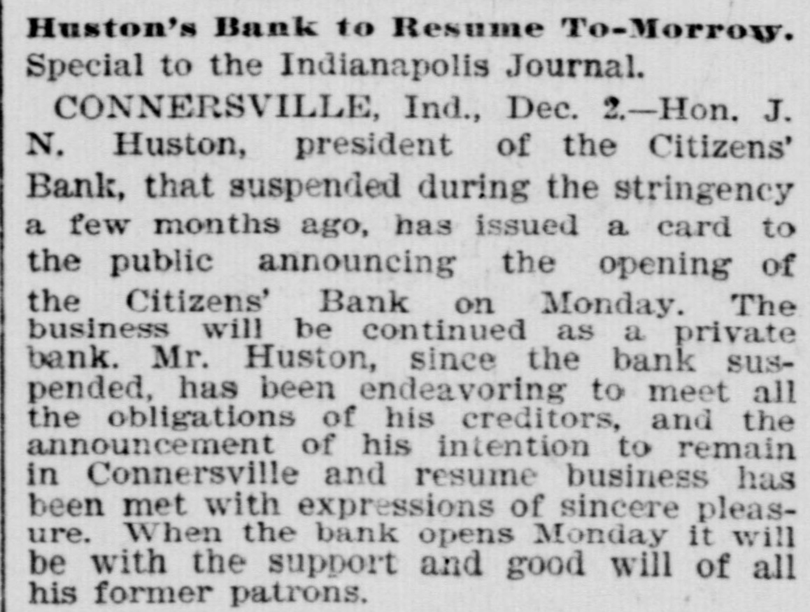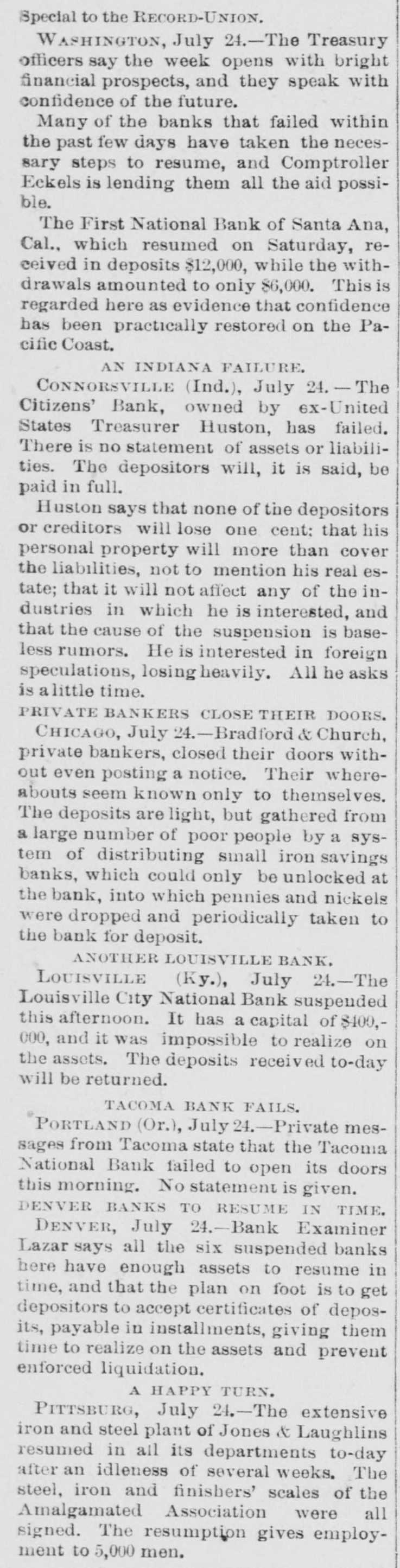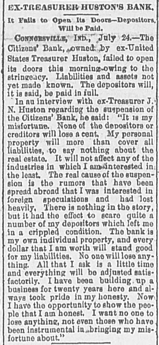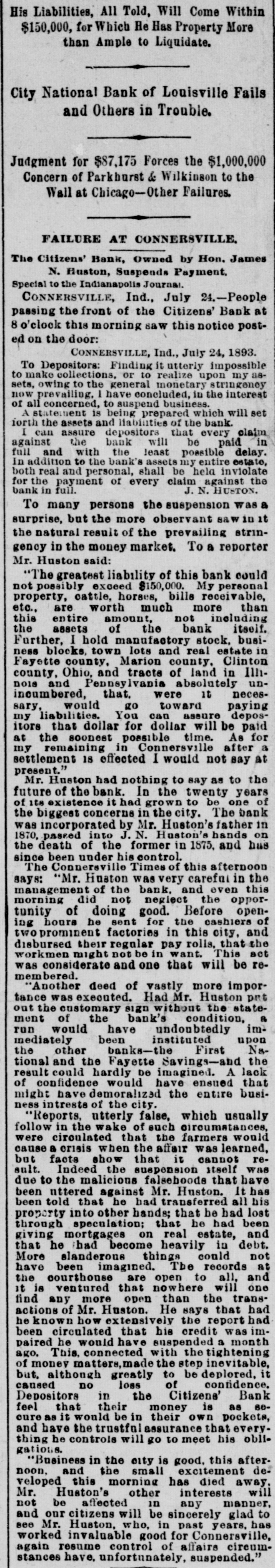 His Liabilities, All Told, Will Come Within $150,000, for Which He Has Property More than Ample to Liquidate. City National Bank of Louisville Fails and Others in Trouble. Judgment for $87,175 Forces the $1,000,000 the Concern of Parkhurst & Wilkinson to Wall at Chicago-Other Failures. FAILURE AT CONNERSVILLE. The Citizens' Bank, owned by Hon. James N. Huston, Suspends Payment. to the Indianapolis Journal. Special CONNERSVILLE, Ind., July 24.-People Bank the front of the Citizens' 8 passing o'clock this morning saw this notice posted on the door: CONNERSVILLE, Ind., July 24, 1893. To make Depositors: collections. Finding or to it realize utterly upon stringency impossible my assets, to prevailing, owing to the I have general concluded, monetary in the interest set now concerned, to suspend business. of all statement is being prepared the which bank. will I can assure will be in forth A the assets and depositors liabilities that of every claim paid against the with bank the least possible entire estate, delay. full and to the bank's assets my inviolate In addition real and personal, shall be hela against the bank in full. for both the payment of every claim J. N. HUSTON. To many persons the suspension was in it but the more observant saw strinsurprise, natural result of the prevailing gency the in the money market. To a reporter Mr. Huston greatest said: liability of this bank personal could "The possibly exceed $150,000. My receivable, entire property, not are cattle, worth horses, much bills more including than etc., this amount, of the not bank itself. the assets I hold manufactory stock. estate busi- in Further, town lots and real Clinton ness blocks, county. Marion county. in IIIFayette Ohio, and tracts of land uncounty, and Pennsylvania absolutely it necesincumbered, nois would that. go were toward paying deposmy sary, liabilities. dollar You for can dollar assure will be As paid for itors that soonest possible time. after a at the in Connersville at my settlement remaining 18 effected I would not say present." Huston had nothing to say as to years the Mr. of the bank. In the twenty be one of future it had grown to The bank of the its biggest existence concerns in Mr. the Huston's city. father in was incorporated into by J. N. Huston's hands and has on the 1870, death passed of the former in 1875, since been Connersville under his Times control. of this afternoon in the The "Mr. Huston was very careful even this says: of the bank. and did Before morning management doing not good. neglect the cashiers oppor- open- of tunity of sent for the and ing hours he factories in this city, that the two prominent their regular pay rolls, This act disbursed not be in want. be reworkmen was considerate might and one that will membered. deed of vastly more Huston impor- pmt "Another executed. Had Mr. statetance the was customary sign without condition, the a run ment out would of the have bank's instituted undoubtedly upon imNamediately other been banks-the First the the the Fayette Savings-at A lack result tional could and hardly be have imagined. ensued that of might confidence have demoralizad would the entire business intrests of utterly the city. false, which circumstances, usually "Reports, in the wake of such the farmers would were follow a circulated crisis when that the affair was cannot learned. recause show that it itself was sult. but facts the Indeed malicious the suspension falsehoods that It have has due to against Mr. all his been nttered he had transferred Huston. had lost been told into that other hands; that be had been property through speculation; that real he estate, and giving mortgages had become on heavily could in debt. not that he slanderous things The records at More imagined. all, and have been are open to will one the courthouse ventured that nowhere the trans it is more open than that had find any Huston. He says had actions how extensively the was he known of Mr. his credit report imbeen circulated he would have that enspended the tightening a month paired ago. This. connected made with the step inevitable, it of money although matters, greatly to of be deplored, confidence. but. caused no in loss the Citizens' as Bank seDepositors feel that their be in money their own is pockets, cure as it would the trustful assurance that his every- obliand thing have he controls will go to meet aftergations. Business in the city small is good. excitement this denoon. veloped and this the morning has interests died away. will Mr. Huston's other in any manner, to not be citizens affected will be sincerely years. glad has and our Huston, who, in past Connersville, see worked Mr. invaluable good of for affairs cireumstances again resume have. unfortunately, control suspended."