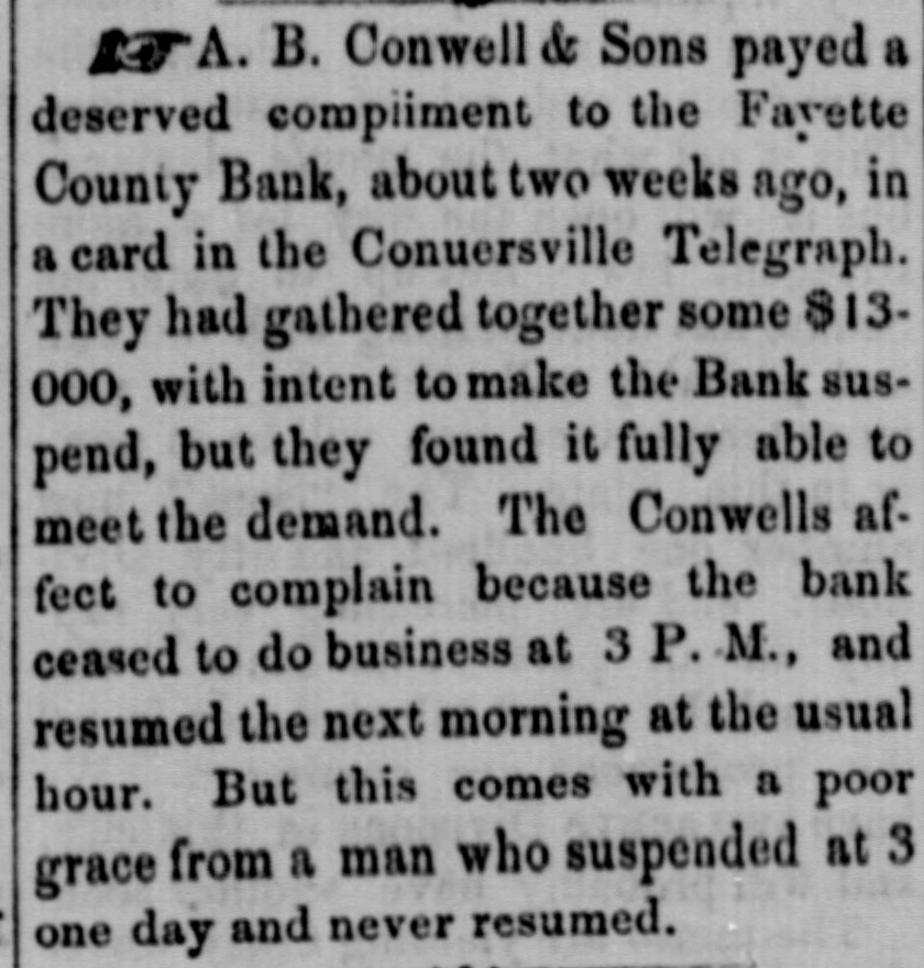 A. B. Conwell & Sons payed a deserved compliment to the Fayette County Bank, about two weeks ago, in a card in the Conuersville Telegraph. They had gathered together some $13000, with intent to make the Bank suspend, but they found it fully able to meet the demand. The Conwells affect to complain because the bank ceased to do business at 3 P. M., and resumed the next morning at the usual hour. But this comes with a poor grace from a man who suspended at 3 one day and never resumed.