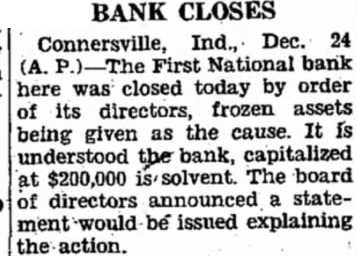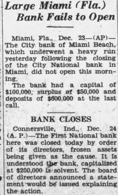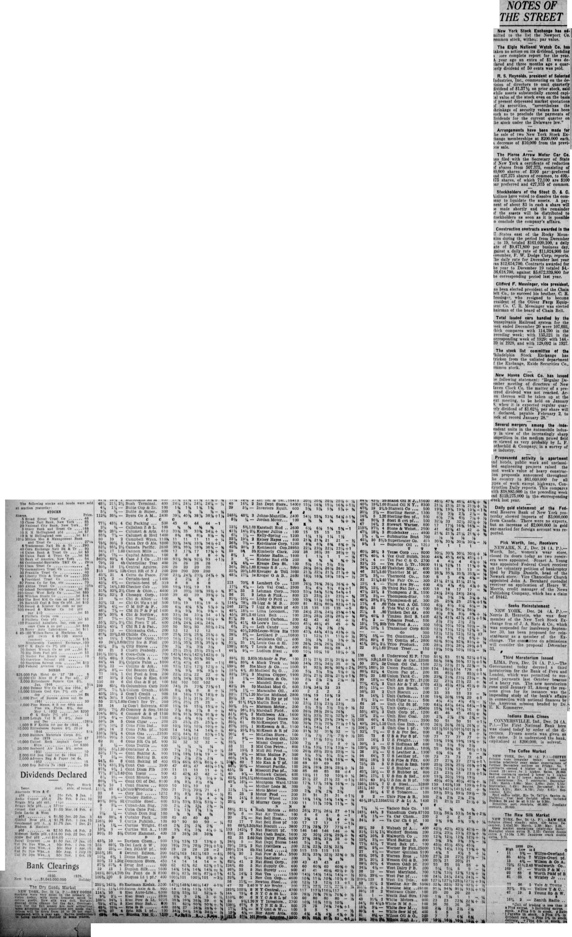 The following stocks bonds were STOCKS Shares Price Trust Broad Chase York Men Co. Co Pick Worth, Inc., Receivers NEWARK, Dec. 24 (A. P.) Worth. women's wear store, Bank closed its doors today two receivers were appointed Stuart Young was appointed Federal Court receiver the voluntary petition of bankruptcy filed by Philip Daniels, head of the Newark store. Vice Chancellor Church appointed John A. Bernhard custodial receiver on application of Henry W. Morris, credit manager of the News Publishing Company. which has claim of $8442. Seeks Reinstatement NEW Dec. 24 (A. Norris B. Henrotin, who was floor Roll member of the New York Stock Ex Tob Prod change firm of Sisto Co., which Corp was for insolvency Septemdo ber 30, has been proposed for reinContinent. statement as member of the Exchange. The committee on admissions Product. 31. consider the proposal December Traer Third Moratorium Issued LIMA. Peru, Dec. 24 (A. 250 Federal decreed BONDS moratorium for the Bank of Peru which permitted suslast October because heavy run. new runs until Among the reafor its issuance impending study the bank's affairs connection American with mission headed by Dr. K. Kemmerer Coal Indiana Bank Closes CONNERSVILLE. Ind. Dec. 24 (A. The First National Bank here was today by order the Frozen assets was Materials given as the cause. It understood the bank capitalized $200,000. is solvent. The Coffee Market YORK COFFEE Bolivia Carpet. opened 8 to May July Wire Jundiahy West Raw Silk Market SILK Wabash pfd Waldorf crack double Bak 1930 Mines 106% York Dry Market NEW Zenith Radio than