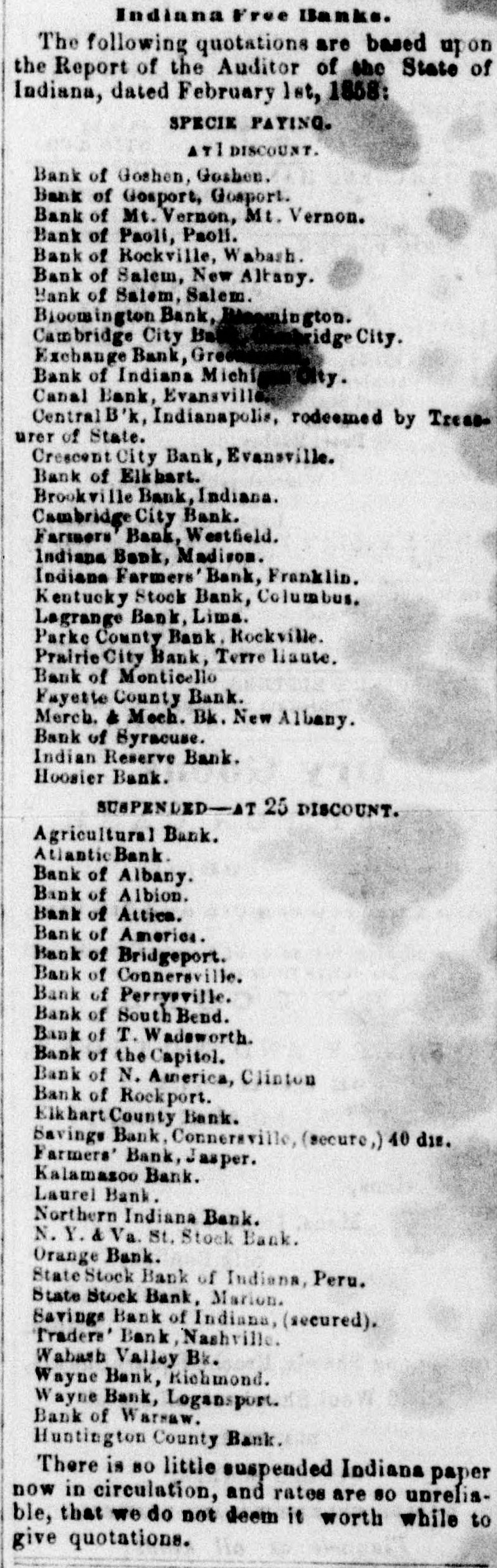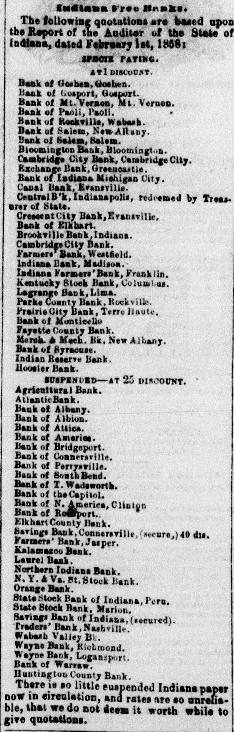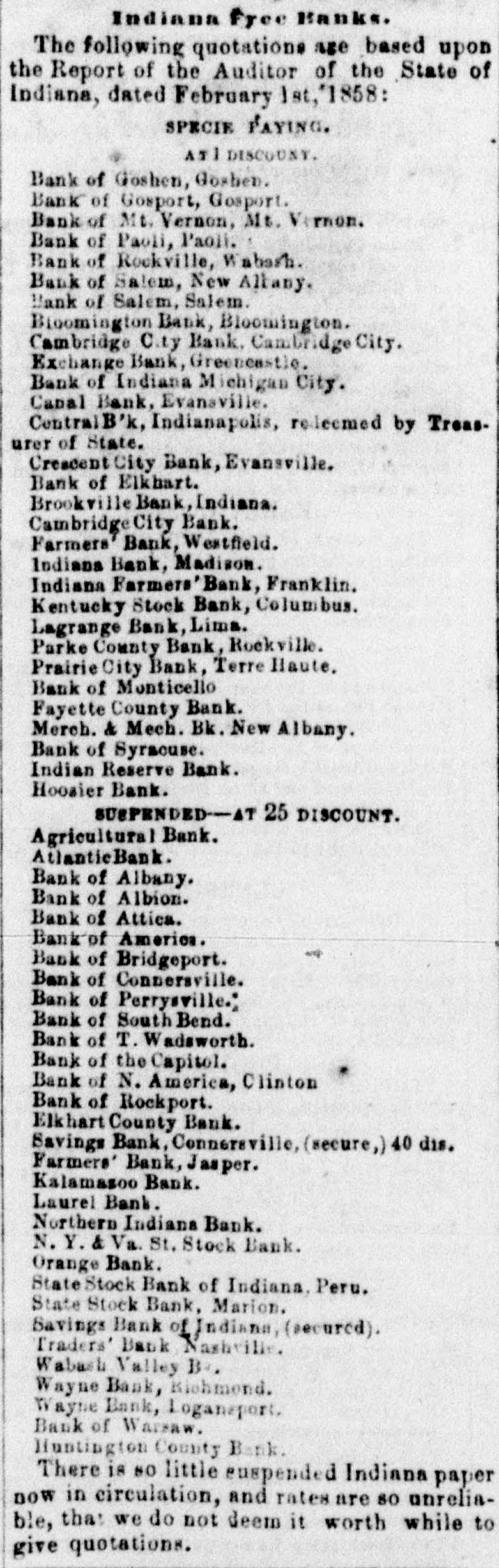 Indiana Free Banks. The following quotations are based up on the Report of the Auditor of the State of Indiana, dated February 1st, 1858: SPECIE PAYING. ATT DISCOUNT. Bank of Goshen, Goshen. Bank of Gosport, Gosport. Bank of Mt. Vernon, Mt. Vernon. Bank of Paoli, Paoli. Bank of Rockville, Wabash. Bank of Salem, New Altany. Bank of Salem, Salem. Bioomington Bank, ington. Cambridge City Ball ridge City. Exchange Bank, Gree Bank of Indiana Michi City. Canal Bank, Evansville Central B'k, Indianapolis, rodeemed by Treasurer of State. Crescent City Bank, Evansville. Bank of Elkbart. Brookvi lle Bank, Indiana. Cambridge City Bank. Farmers Bank, Westfield. Indiana Bank, Madison. Indiana Farmers' Bank, Franklin. Kentucky Stock Bank, Columbus. Lagrange Bank, Lima. Parke County Bank. Rockville. Prairie City Bank, Terre liaute. Bank of Monticello Fayette County Bank. Merch. & Mech. Bk. New Albany. Bank of Syracuse. Indian Reserve Bank. Hoosier Bank. SUSPENDED-AT 25 DISCOUNT. Agricultural Bank. AtlanticBank. Bank of Albany. Bank of Albion. Bank of Attica. Bank of America. Bank of Bridgeport. Bank of Connersville. Bank of Perrysville. Bank of South Bend. Bank of T. Wadsworth. Bank of the Capitol. Bank of N. America, Clinton Bank of Rockport. Elkhart County Bank. Savings Bank, Connersville, (secure,) 40 dis. Farmers' Bank, Jasper. Kalamasoo Bank. Laurel Bank. Northern Indiana Bank. N. Y. & Va. St. Stock Bank. Orange Bank. State Stock Bank of Indiana, Peru. State Stock Bank, Marion. Savings Bank of Indiana, (secured). Traders' Bank, Nashville. Wabash Valley Bk. Wayne Bank, Richmond. Wayne Bank, Logansport. Bank of Warsaw. Huntington County Bank. There is 80 little suspended Indiana paper now in circulation, and rates are so unreliable, that we do not deem it worth while to give quotations.