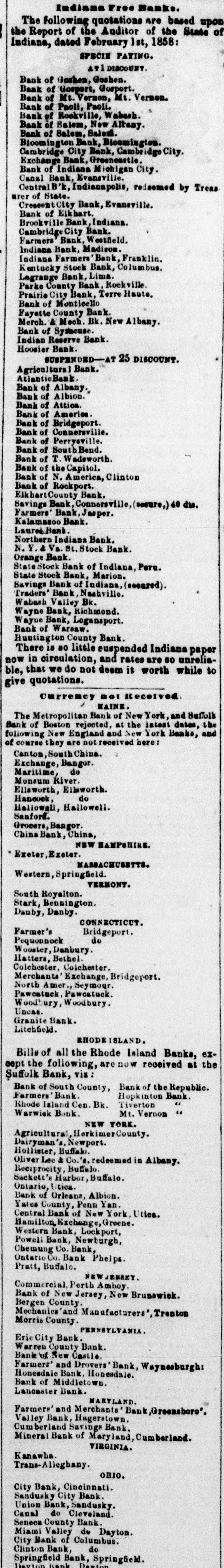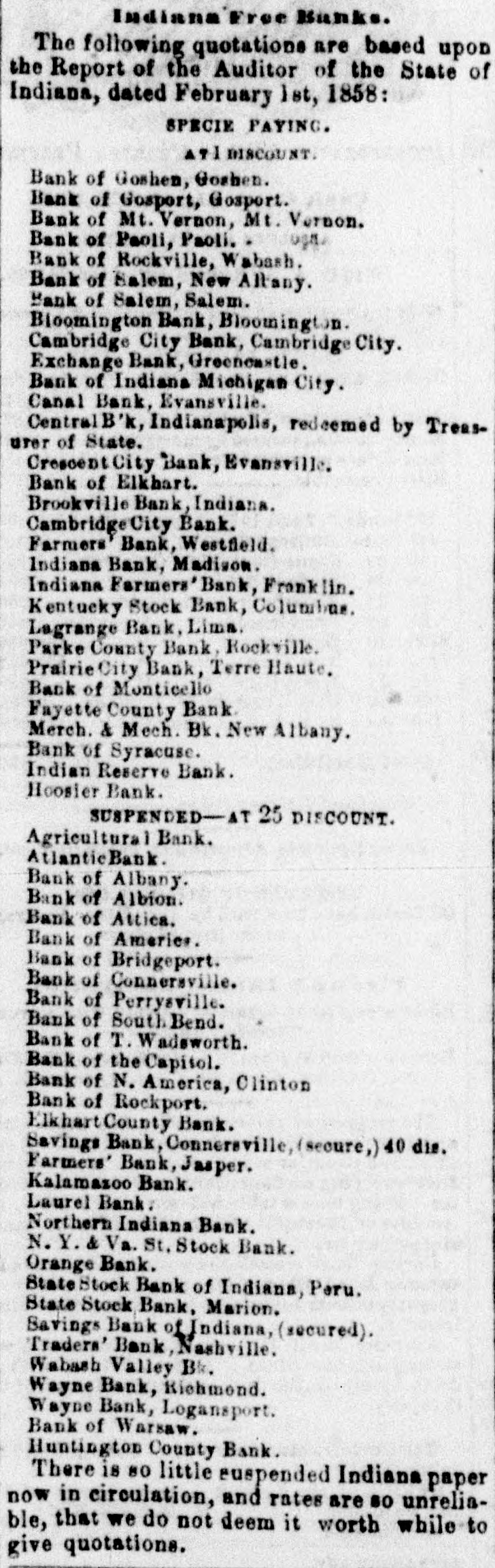 Indiana Free Banks. The following quotations are based upon the Report of the Auditor of the State of Indiana, dated February 1st, 1858: SPECIE PAYING. ATI DISCOUNT. Bank of Goshen, Gooben. Bank of Gosport, Gosport. Bank of Mt. Vermon, Mt. Vernon. Bank of Paoli, Paoli. Bank of Reckville, Wabash. Bank of Salem, New Altany. Bank of Salem, Salem. Bioomington Bank, Bloomington. Cambridge City Bank, Cambridge City. Exchange Bank, Greeneastle. Bank of Indiana Michigan City. Canal Bank, Evansville. Central B'k, Indianapolis, redeemed by Treasurer of State. Crescent City Bank, Evansville. Bank of Elkhart. Brookville Bank, Indiana. Cambridge City Bank. Farmers Bank, Westfield. Indiana Bank, Madison. Indiana Farmers' Bank, Franklin. Kentucky Stock Bank, Columbus. Lagrange Bank, Lima. Parke County Bank, Rockville. Prairie City Bank, Terre Haute, Bank of Monticello Fayette County Bank. Merch. & Mech. Bk. New Albany. Bank of Syracuse. Indian Reserve Bank. Hoosier Bank. SUSPENDED-AT 25 DISCOUNT. Agricultural Bank. AtlanticBank. Bank of Albany. Bank of Albion. Bank of Attica. Bank of America. Bank of Bridgeport. Bank of Connersville. Bank of Perrysville. Bank of South Bend. Bank of T. Wadsworth. Bank of the Capitol. Bank of N. America, Clinton Bank of Rockport. Elkhart County Bank. Savings Bank, Connersville, (secure,) 40 dis. Farmers' Bank, Jasper. Kalamasoo Bank. Laurel Bank. Northern Indiana Bank. N.Y. & Va. St. Stock Bank. Orange Bank. State Stock Bank of Indiana, Peru. State Stock Bank, Marion. Savings Bank of Indiana, (secured). 'Traders' Bank, Nachville. Wabash Valley Bk. Wayne Bank, Richmond. Wayne Bank, Logansport. Bank of Warsaw. Huntington County Bank. There is so little suspended Indiana paper now in circulation, and rates are so unreliable, that we do not deem it worth while to give quotations.