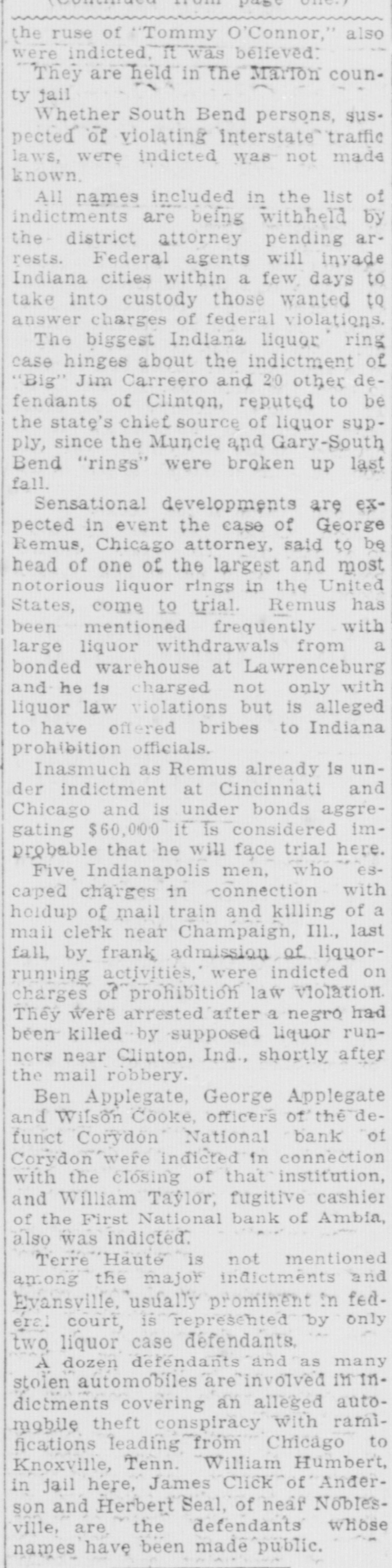the ruse of Tommy O'Connor," also were indicted. it was believed: They are held in the Marton county jail Whether South Bend persons, suspected of violating interstate traffic laws, were indicted was not made known. All names included in the list of indictments are being withheld by the district attorney pending arrests. Federal agents will inyade Indiana cities within a few days to take into custody those wanted to answer charges of federal violations. The biggest Indiana liquor ring case hinges about the indictment of Big" Jim Carreero and 20 other defendants of Clinton, reputed to be the state's chief source of liquor supply, since the Muncle and Gary-South Bend "rings" were broken up last fall. Sensational developments are expected in event the case of George Remus, Chicago attorney, said to be head of one of the largest and most notorious liquor rings in the United States, come to trial. Remus has been mentioned frequently with a large liquor withdrawals from bonded warehouse at Lawrenceburg and he is charged not only with liquor law violations but is alleged to have offered bribes to Indiana prohibition officials. Inasmuch as Remus already is under indictment at Cincinnati and Chicago and is under bonds aggregating $60,000 it is considered improbable that he will face trial here. Five Indianapolis men, who escaped charges in connection with heldup of mail train and killing of a mail clerk near Champaign, III., last fall, by frank admission of liquorrunning activities, were indicted on charges of prohibition law violation. They were arrested after a negro had been killed by supposed liquor runnors near Clinton, Ind., shortly after the mail robbery. Ben Applegate, George Applegate and Wilson Cooke officers of the defunct Corydon National bank of Corydon were indicted in connection with the closing of that institution, and William Taylor, fugitive cashier of the First National bank of Ambia, also was indicted. Terre Haute is not mentioned among the major indictments and Evansville, usually prominent in federal court, is represented by only two liquor case défendants. A dozen defendants and as many stolen automobiles are involved in indictments covering an alleged automobile theft conspiracy with ramifications leading from Chicago to Knoxville, Tenn. William Humbert, in jail here, James Click of Anderson and Herbert Seal, of near Noblesville, are the defendants whose names have been made public.