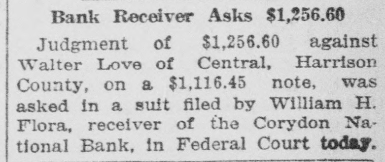 Bank Receiver Asks $1,256.60 Judgment of $1,256.60 against Walter Love of Central, Harrison County, on a $1,116.45 note, was asked in a suit filed by William H. Flora, receiver of the Corydon National Bank, in Federal Court today.