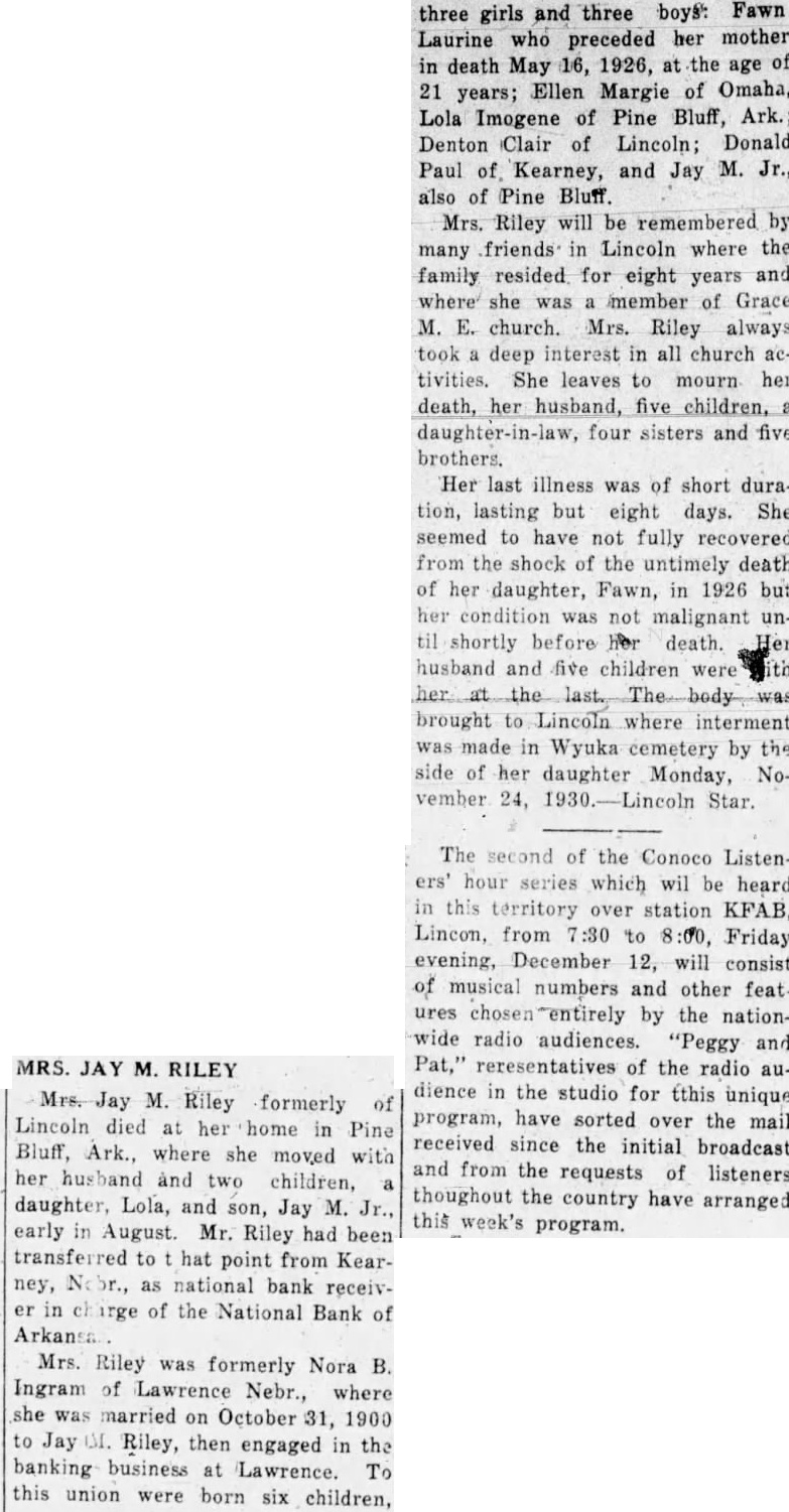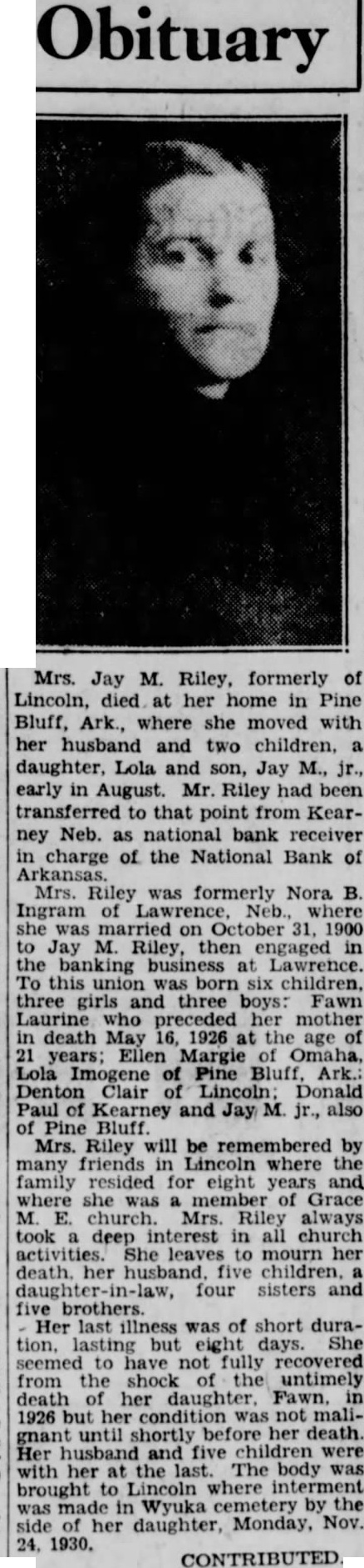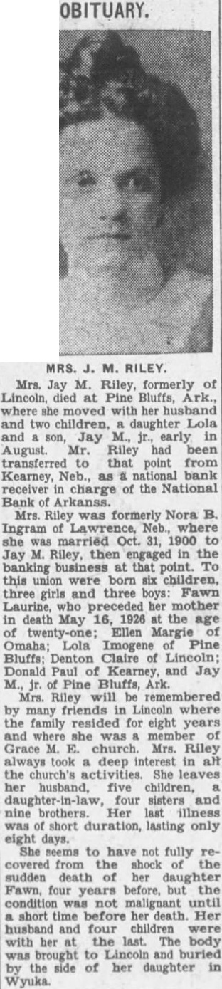 Mrs. Jay M. Riley formerly of Lincoln died at her home in Pine Bluff, Ark., where she moved with her husband and two children, a daughter, Lola, and son, Jay M. Jr., early in August. Mr. Riley had been transferred to hat point from Kearney, No br., as national bank receiver in ch irge of the National Bank of Arkansa Mrs. Riley was formerly Nora B. Ingram of Lawrence Nebr., where she was married on October 31, 1900 to Jay OI. Riley, then engaged in the banking business at Lawrence. To this union were born six children, three girls and three boys: Fawn Laurine who preceded her mother in death May 16, 1926, at the age of 21 years; Ellen Margie of Omaha, Lola Imogene of Pine Bluff, Ark.; Denton Clair of Lincoln; Donald Paul of Kearney, and Jay M. Jr., also of Pine Bluff. Mrs. Riley will be remembered by many friends in Lincoln where the family resided for eight years and where she was a member of Grace M. E. church. Mrs. Riley always took a deep interest in all church activities. She leaves to mourn her death, her husband, five children, a daughter-in-law, four sisters and five brothers. Her last illness was of short duration, lasting but eight days. She seemed to have not fully recovered from the shock of the untimely death of her daughter, Fawn, in 1926 but her condition was not malignant until shortly before her death. Her husband and five children were to her the last. The body brought to Lincoln where interment was made in Wyuka cemetery by the side of her daughter Monday, November 24, 1930.-Lincoln Star.