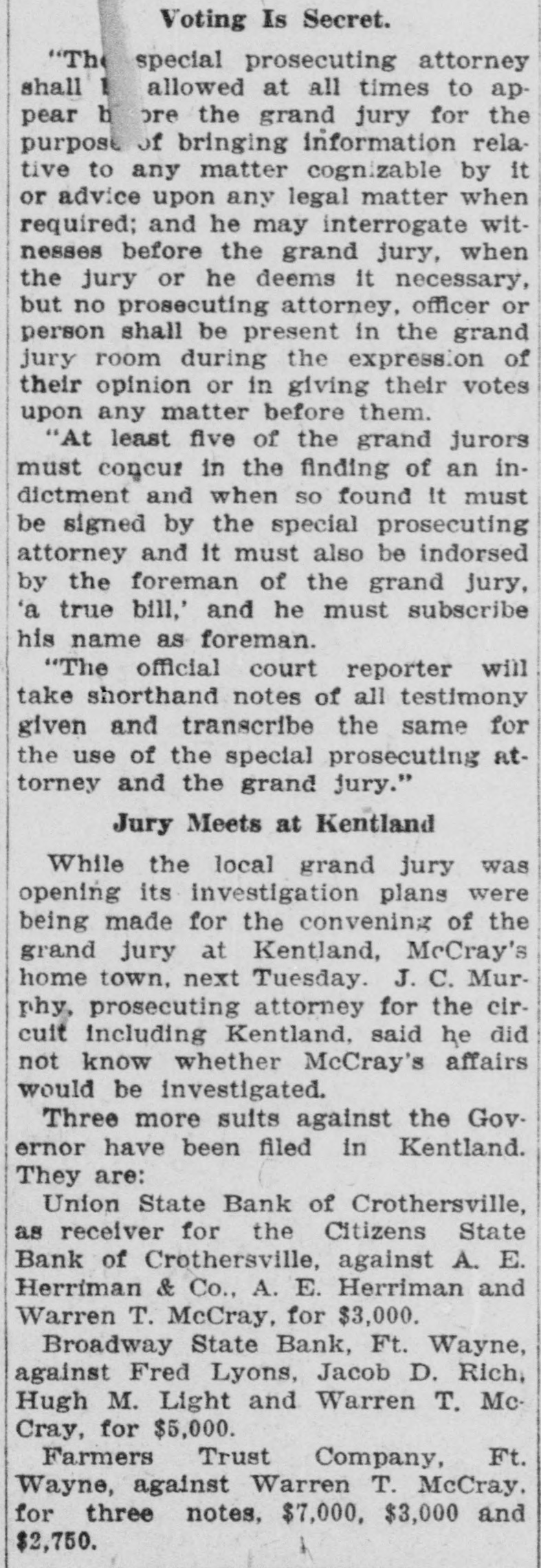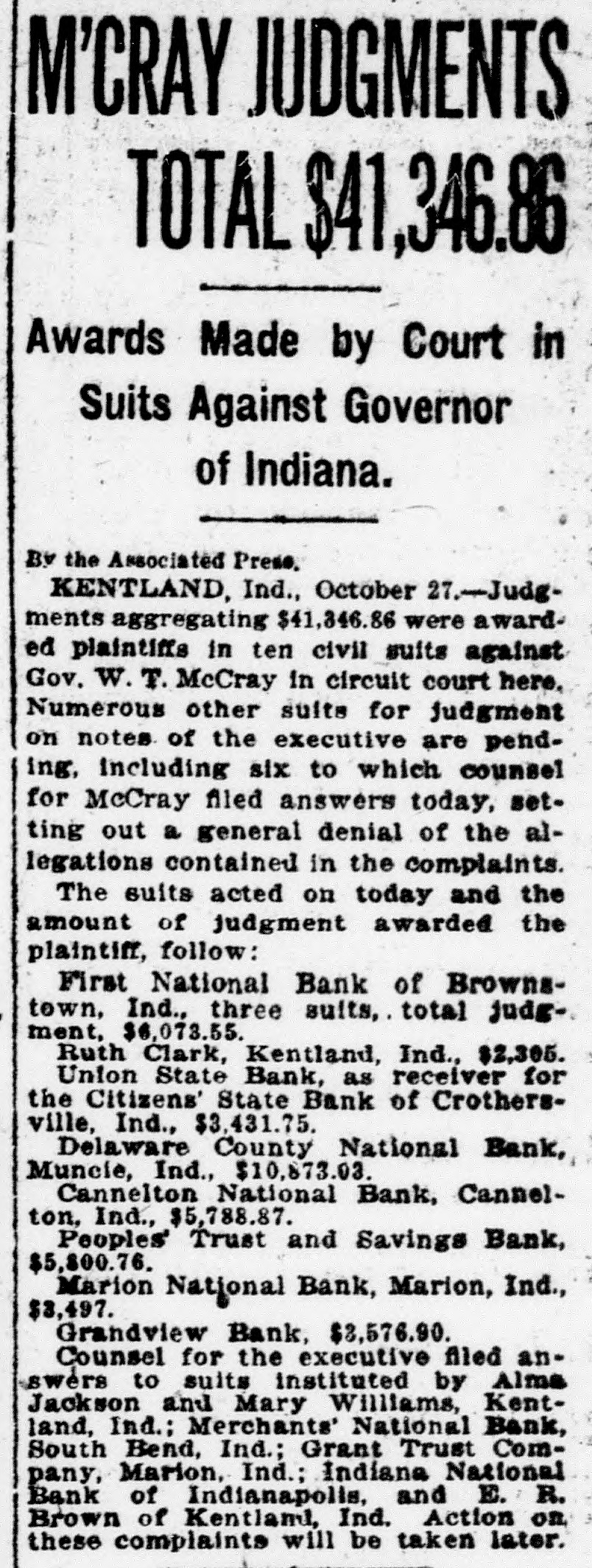 M'CRAY JUDGMENTS TOTAL $41 346.86 266 Awards Made by Court in Suits Against Governor of Indiana. By the Associated Prese. KENTLAND, Ind., October 27.-Judgments aggregating $41,346.86 were award. ed plaintiffs in ten civil suits against Gov. W. T. McCray in circuit court here. Numerous other suits for judgment on notes of the executive are pending, including six to which counsel for McCray filed answers today, setting out a general denial of the allegations contained in the complaints. The suits acted on today and the amount of judgment awarded the plaintiff, follow: First National Bank of Brownstown, Ind., three suits, total judgment, $6,073.55. Ruth Clark, Kentland, Ind., $2,305. Union State Bank, as receiver for the Citizens' State Bank of Crothersville, Ind., $3,431.75. Delaware County National Bank, Muncle, Ind., $10,873.03. Cannelton National Bank, Cannelton, Ind., $5,788.87. Peoples' Trust and Savings Bank, $5,800.76. Marion National Bank, Marion, Ind., $3,497. Grandview Bank, $3,576.90. Counsel for the executive filed answers to suits instituted by Alma Jackson and Mary Williams, Kentland, Ind.: Merchants' National Bank, South Bend, Ind.; Grant Trust Company, Marion. Ind.; Indiana National Bank of Indianapolis, and E. R. Brown of Kentlant, Ind. Action on these complaints will be taken later.