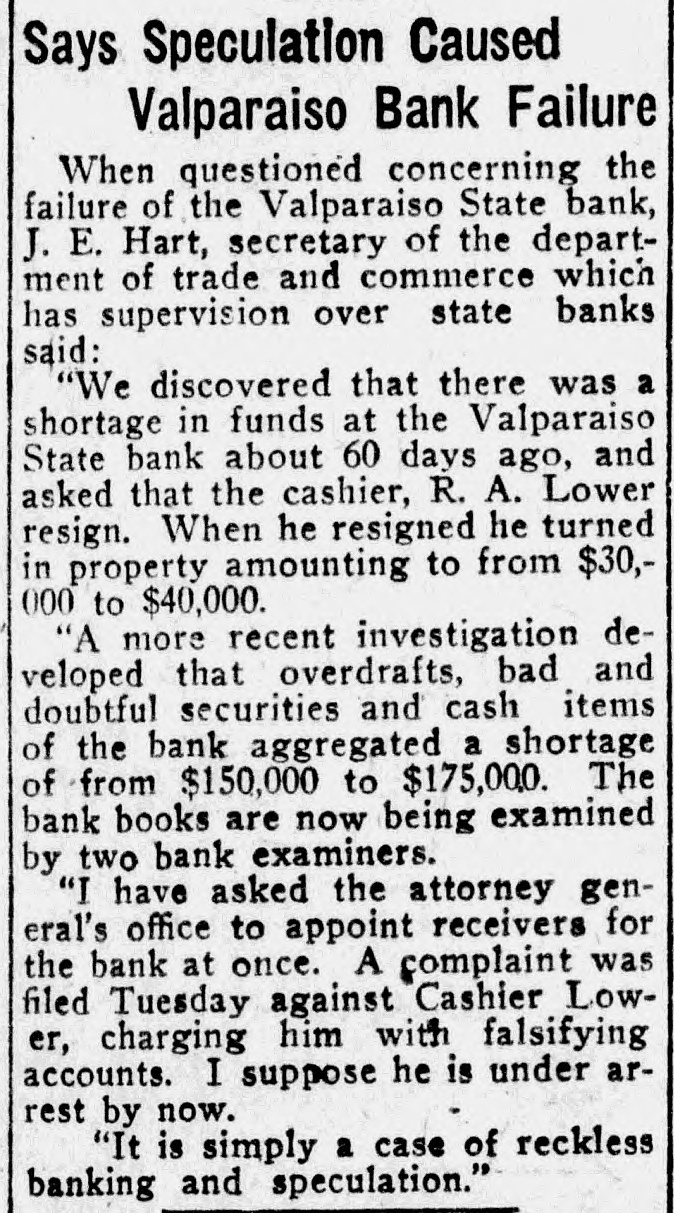 Says Speculation Caused Valparaiso Bank Failure When questioned concerning the failure of the Valparaiso State bank, J. E. Hart, secretary of the department of trade and commerce which has supervision over state banks said: "We discovered that there was a shortage in funds at the Valparaiso State bank about 60 days ago, and asked that the cashier, R. A. Lower resign. When he resigned he turned in property amounting to from $30,000 to $40,000. "A more recent investigation developed that overdrafts, bad and doubtful securities and cash items of the bank aggregated a shortage of from $150,000 to $175,00.0. The bank books are now being examined by two bank examiners. "I have asked the attorney general's office to appoint receivers for the bank at once. A complaint was filed Tuesday against Cashier Lower, charging him with falsifying accounts. I suppose he is under arrest by now. "It is simply a case of reckless banking and speculation."