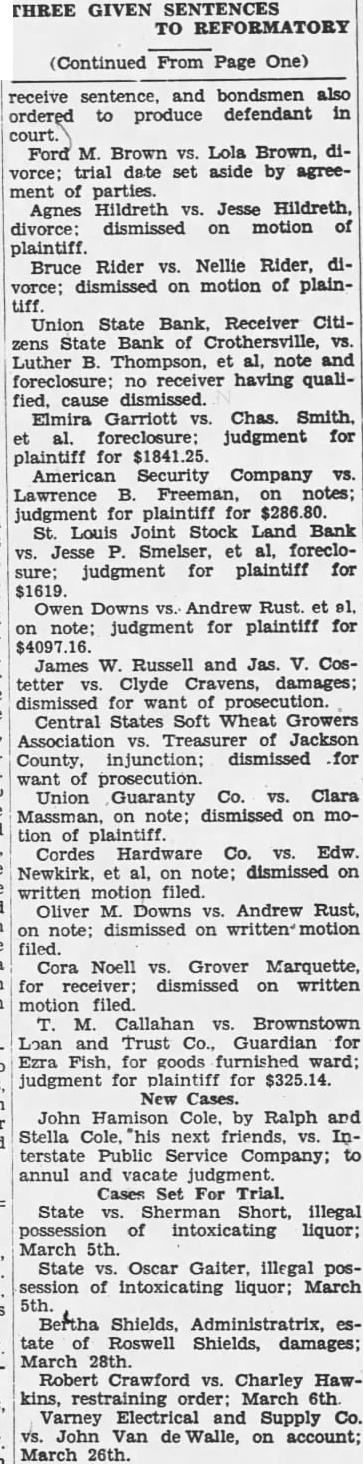 THREE GIVEN SENTENCES TO REFORMATORY (Continued From Page One) receive sentence, and bondsmen also ordered to produce defendant in Ford M. Brown VS. Lola Brown, divorce; trial date set aside by agreement of parties. Agnes Hildreth vs. Jesse Hildreth, divorce: dismissed on motion of plaintiff. Rider Nellie Rider, diBruce vorce; dismissed on motion of plaintiff. Union State Bank. Receiver Citizens State Bank of Crothersville, vs. Luther B. et note and no receiver having qualified, cause Elmira Garriott Chas. judgment for plaintiff American Security Company VS. Lawrence Freeman, on notes; judgment for plaintiff for Louis Joint Stock Land Bank Jesse al, foreclovs. judgment for plaintiff for $1619 Owen Downs Andrew Rust judgment for plaintiff for James W. Russell and Jas. Costetter Clyde Cravens, damages; dismissed for want prosecution. Central States Soft Wheat Growers Association Treasurer Jackson County, dismissed for want prosecution. Union Guaranty Co. VS. Clara on note; dismissed on motion of plaintiff Cordes Hardware Co. Edw. Newkirk, al, on note; dismissed on written motion filed. Oliver M. Downs Andrew Rust, on note; dismissed on filed. Cora Noell VS. Grover Marquette, for dismissed on written motion filed. M. Callahan Brownstown Loan and Trust Co., Guardian for Ezra Fish, for goods furnished ward; judgment for plaintiff for $325.14. New Cases. John Hamison Cole, by Ralph and Stella Cole, next friends, Interstate Public Service Company; annul and vacate judgment. Cases Set For Trial. State Short, illegal of intoxicating liquor; March 5th. State Oscar Gaiter, illegal possession of intoxicating liquor; March Bertha Shields, Administratrix, estate of Roswell Shields, damages; March 28th. Crawford VS. Charley Hawkins, order: March 6th Varney and Supply Co. John Van Walle, on account; March 26th.