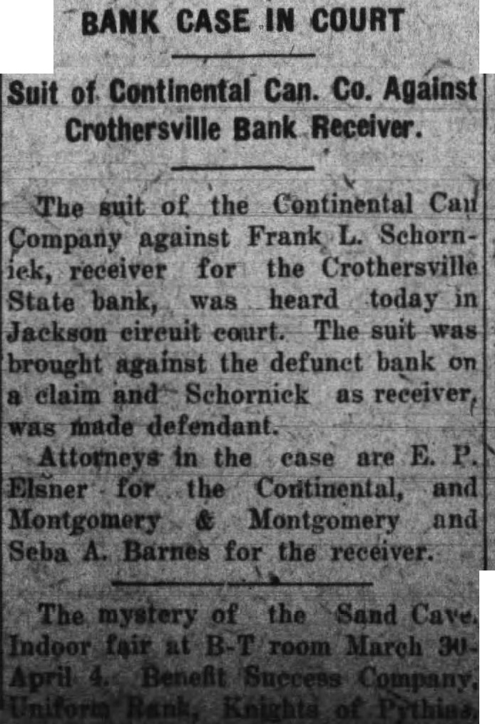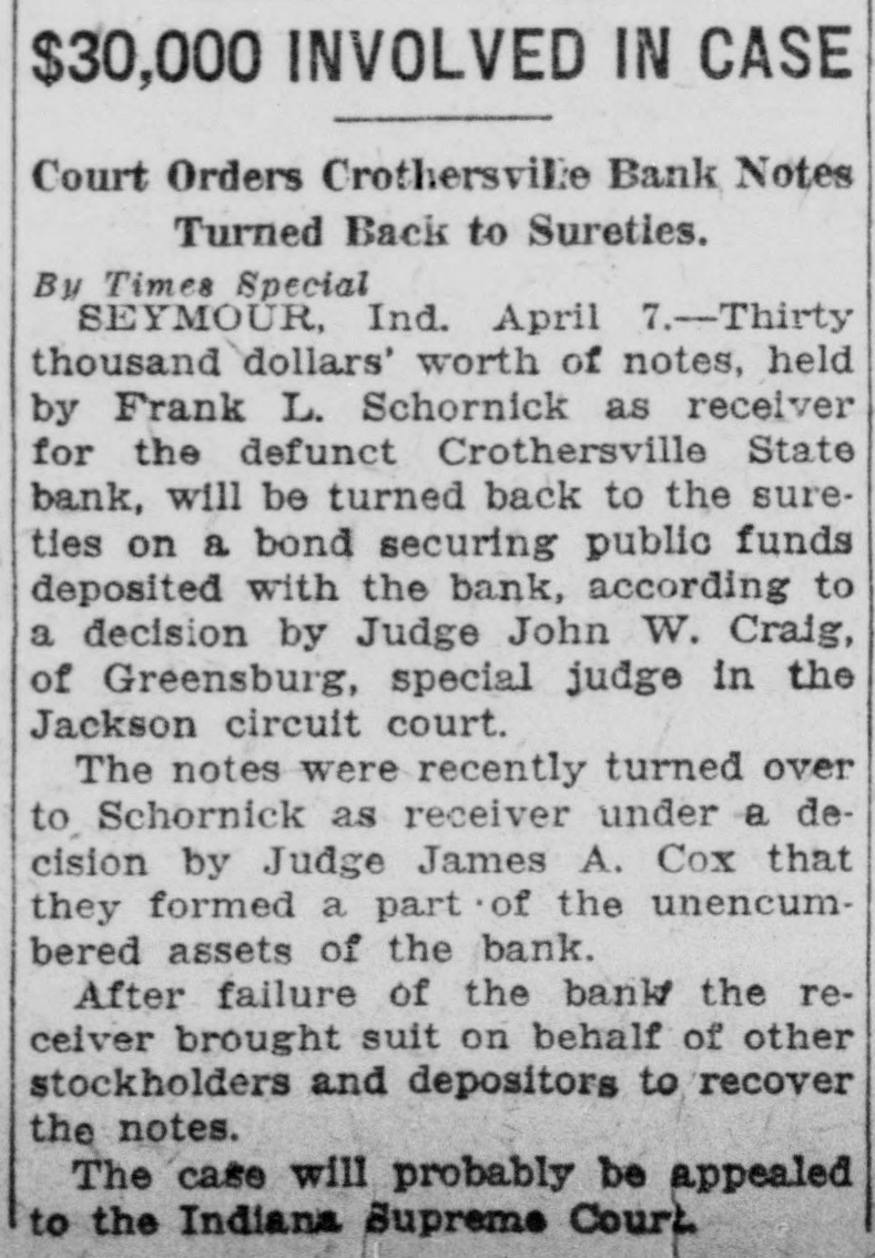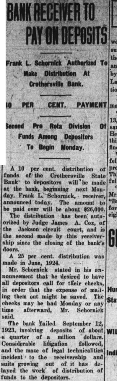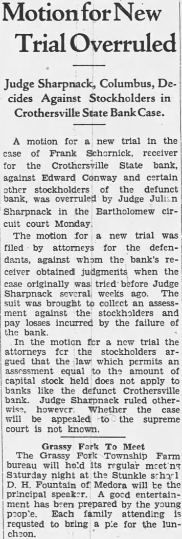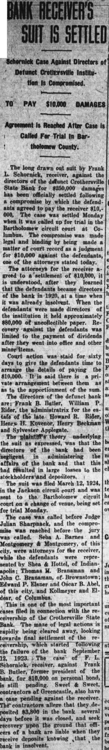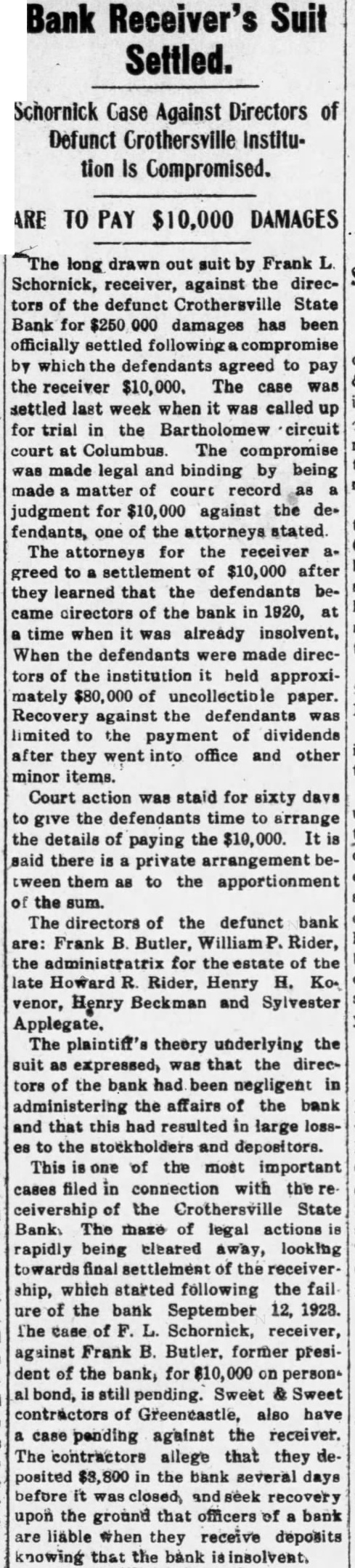 The long drawn out suit by Frank Schornick, receiver, against the directors of the deffunet Crothersville State Bank for damages has been officially settled following compromise by which the defendants agreed the receiver $10,000, The case was settled Monday when called for trial in the Bartholomew circuit court at Columbus. The compromise was made legal and binding by being made matter of court record judgment for $10,000 against the defendants, of the attorneys stated today. The attorneys for the receiver greed to settlement of $10,000, understood, after they learned that the defendants became directors the bank in at time when was already insolvent. When the defendants were made directors of the institution held approximately $80,000 of uncollectible paper. Recovery against the defendants was limited to the payment of dividends after they went into office and other minor items. Court action staid for sixty days to give the defendants time arrange the details of paying the $10,000. said there is priarrangement between them as to the apportionment of the sum. The directors of the defunet bank Frank Butler, William Rider, the administratrix for the esof tafe of the Howard R. Rider, Henry Kovenor, Henry Beckman and Sylvester Applegate. The theory underlying the suit as expressed, was that the directors of the bank had been administering the negligent affairs of the bank and that this had resulted in large losses to the depositors. The suit was filed March 12, 1924, in the Jackson circuit eourt and was sent to the Bartholomew circuit court on change of venue, being set for trial Monday. The case was called before Judge Julian Sharpnack, and the compromise was reached before the jury called. Seba Barnes and Montgomery Montgomery, of this city, were attorneys for the receiver, while the defendants were represented by Shea & Hottel, of Indianapolis: Thomas M. Branaman and John Branaman, of Brownstown; Edward Elsner and Oscar Abel, this city, and Kollmeyer and dear, of Columbus. This is one of the most important cases filed in connection with the ceivership of the Crothersville State of Bank. The maze of legal actions rapidly being cleared away, looking towards final settlement of the ceivership, which started following failure of the bank September 12, 1923. The against Frank Butler, former president of the for $10,000 on personal bond, still pending. Sweet Sweet, contractors of Greencastle, also have pending against the receiver. contractors allege that posited $3,800 in the bank several before was closed, and seek days recovery upon the ground that offiof bank are liable when they cers receive deposits knowing bank is insolvent.